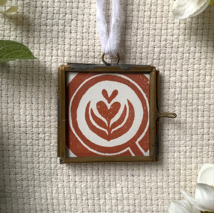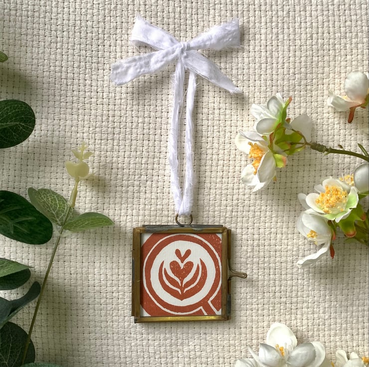 The original print sits in a 5 x 5 cm frame and finished off with a with a white bow made of repurposed cotton.