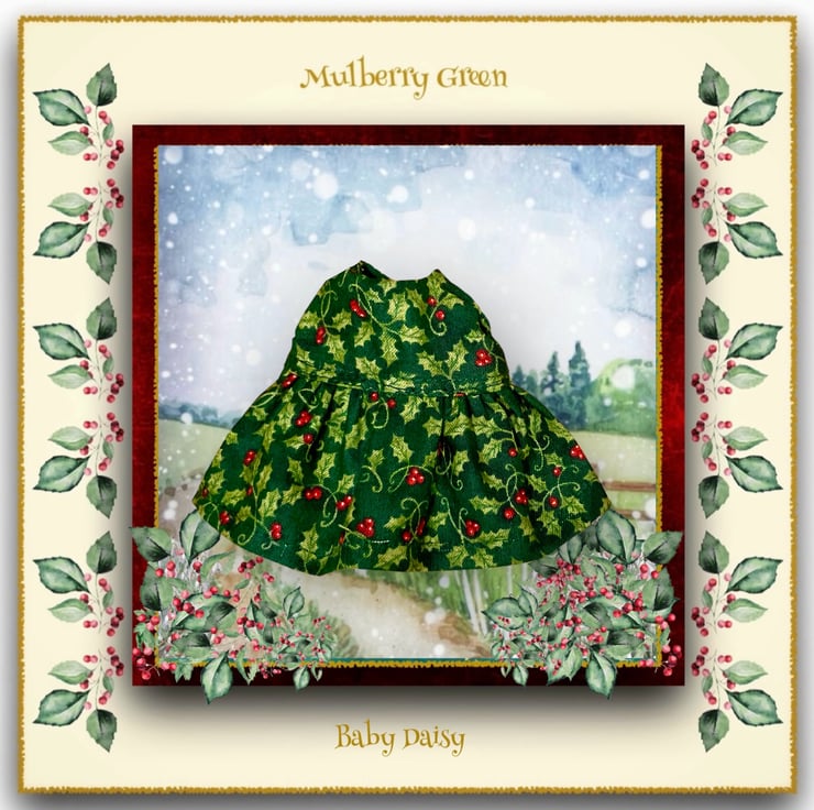 A pretty little dress, in a holly print for baby Daisy. The dress is handmade from best quality cotton, has a lined bodice and fastens at the back with a little popper