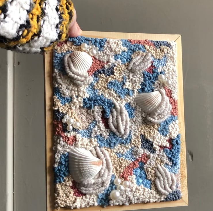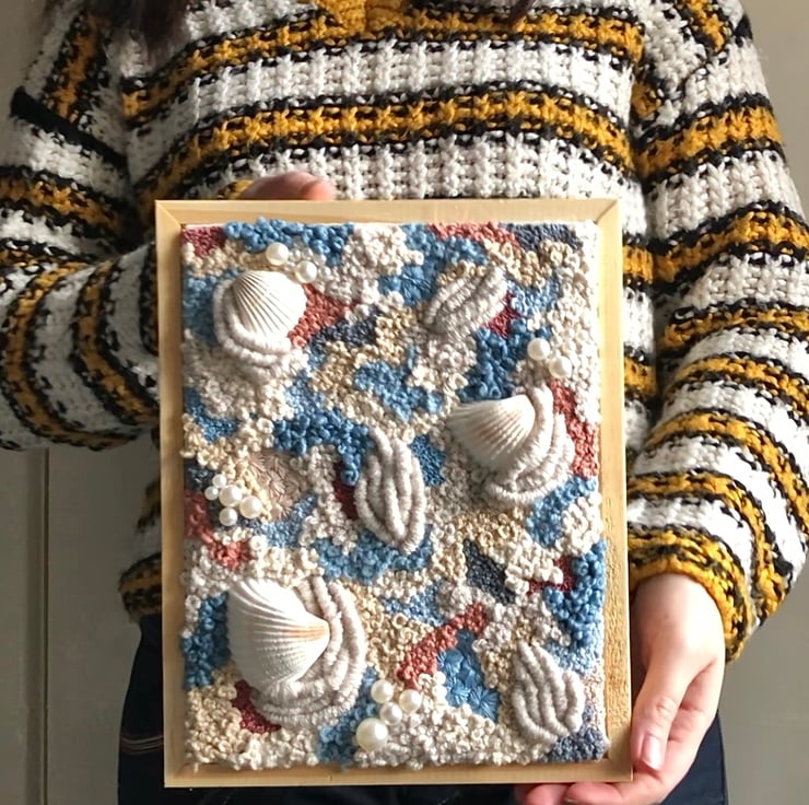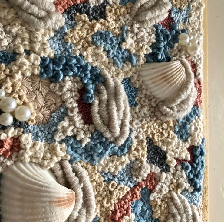 Celestial tides a 10x8 inch one of a kind framed canvas art piece. Embroidery thread, yarn, beads and shell have been hand stitched into a beige fabric in an abstract pattern. This has created a piece of art which is both eye catching and unique the perfect addition to any home.