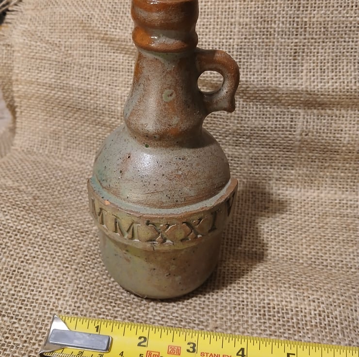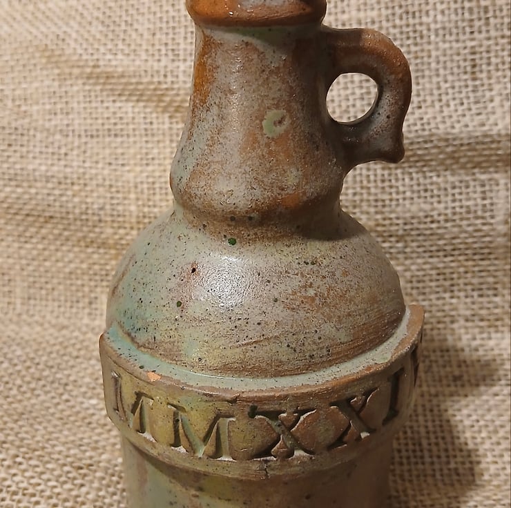 Handmade ceramic Witch Bottle with decorative glaze and Roman numeral inscription for the year 2024.