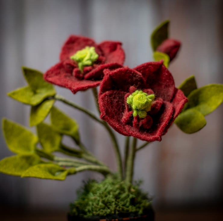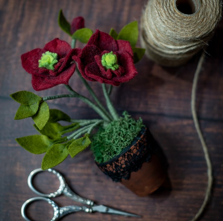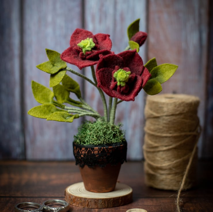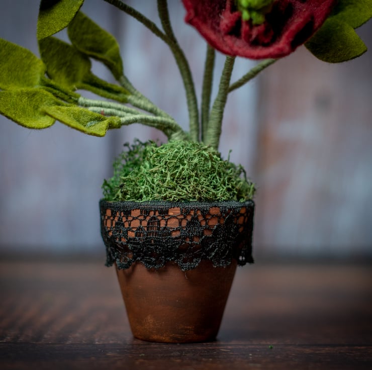 This item is designed by me and made from wire, felt fabric, and stabilized moss. Bringing an everlasting bloom to your decor, the terracotta pot is adorned with dark lace, adding a gothic and witchy vibe to this unique ornament. The dark lace is easily removable.
