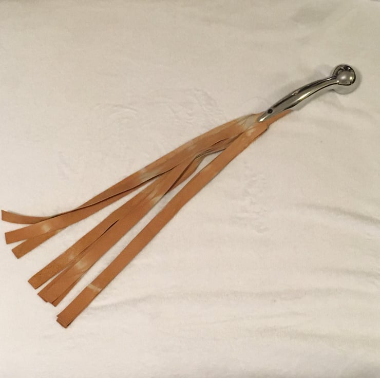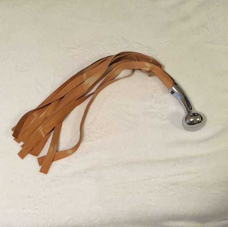 Lightweight orange/ white tie dyed effect leather flogger w/chrome handle (1-1.5 oz in weight). One of the photos is a close up of the leather before it was hand cut.