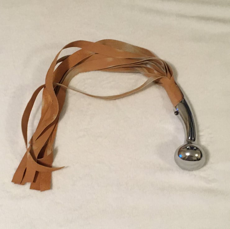 There are 11 falls total (3/4" wide and roughly 18" in length). The entire flogger is handcut, NOT machine cut, so there are always imperfections. The leather is wrapped around a wooden dowel center and then held in place in the handle with screws. The flogger is handmade by me (Little1) so you know it was made with love !