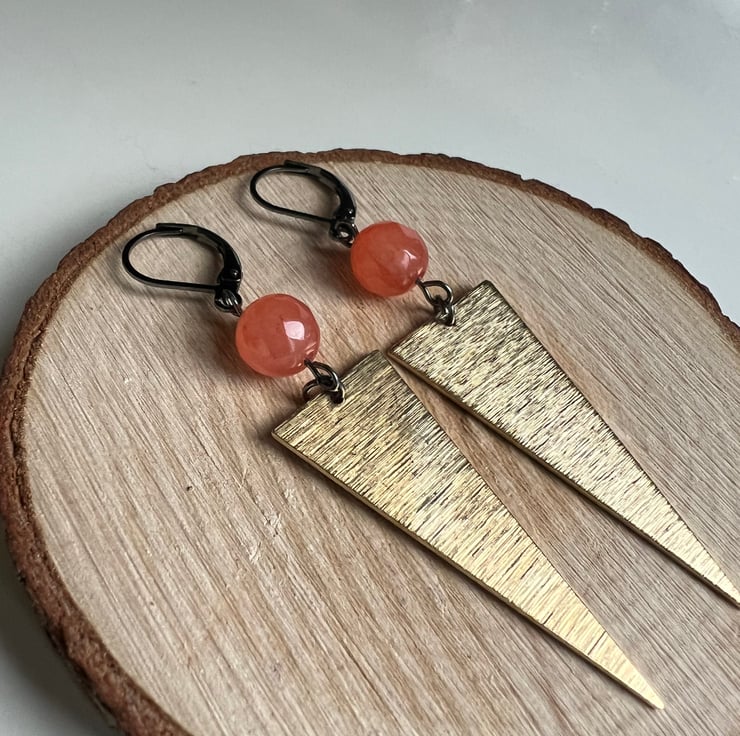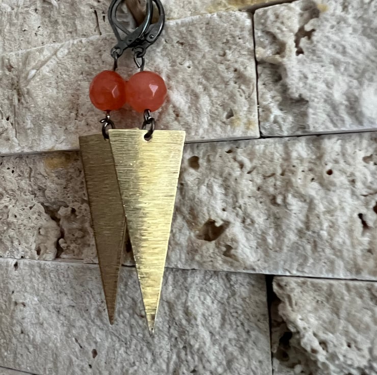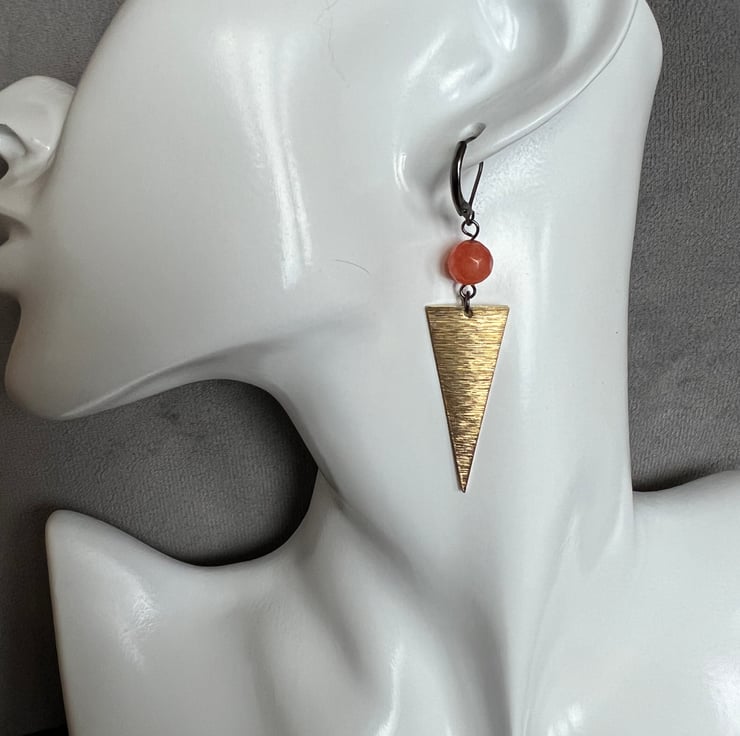 These earrings combine symbolism, vibrant energy, and durability. The triangle shape represents balance, strength, and spiritual growth, while the carnelian stone is known for its warm, energizing properties—boosting courage, creativity, and confidence. Finished with sleek gunmetal lever-back ear wires for a modern touch, they’re secure, stylish, and designed to inspire both beauty and empowerment.