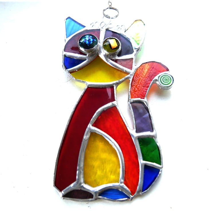 SOLD Cat Suncatcher Yellow Tum Stained Glass Rainbow Picasso Patchwork 017