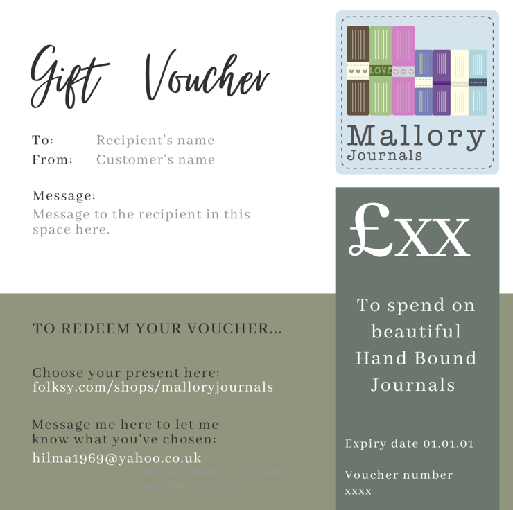 Can't decide which Journal to buy for a gift? Need a Special Gift but not sure what to choose? Need a last minute gift? Why not give a Gift Voucher! The recipient can choose exactly what they would like, including a Custom Journal from Mallory Journals!