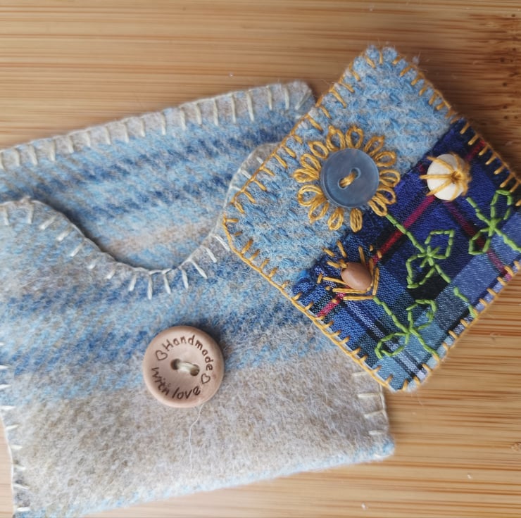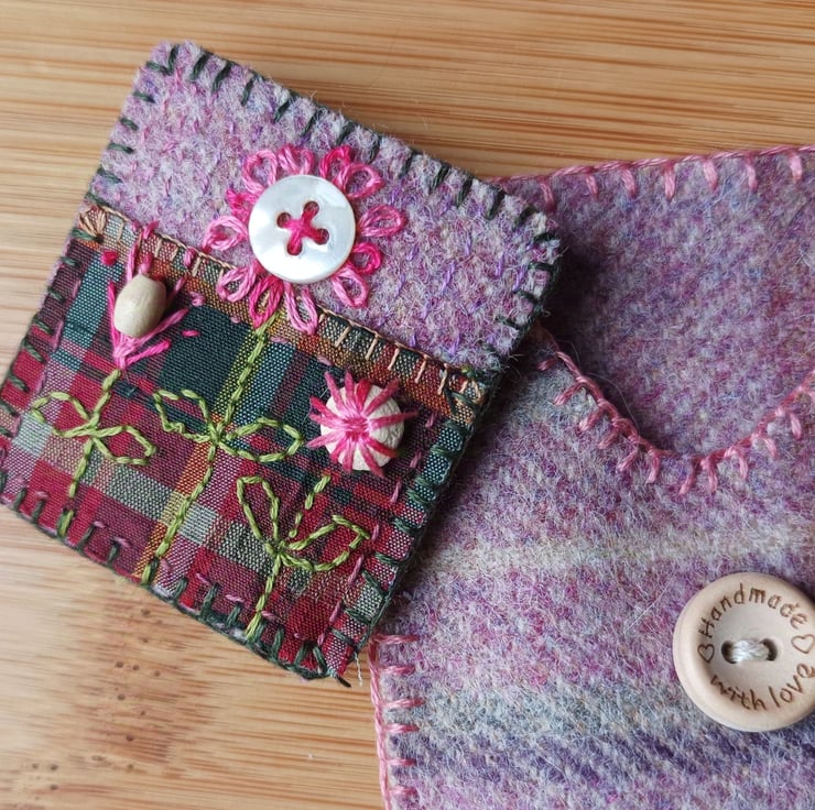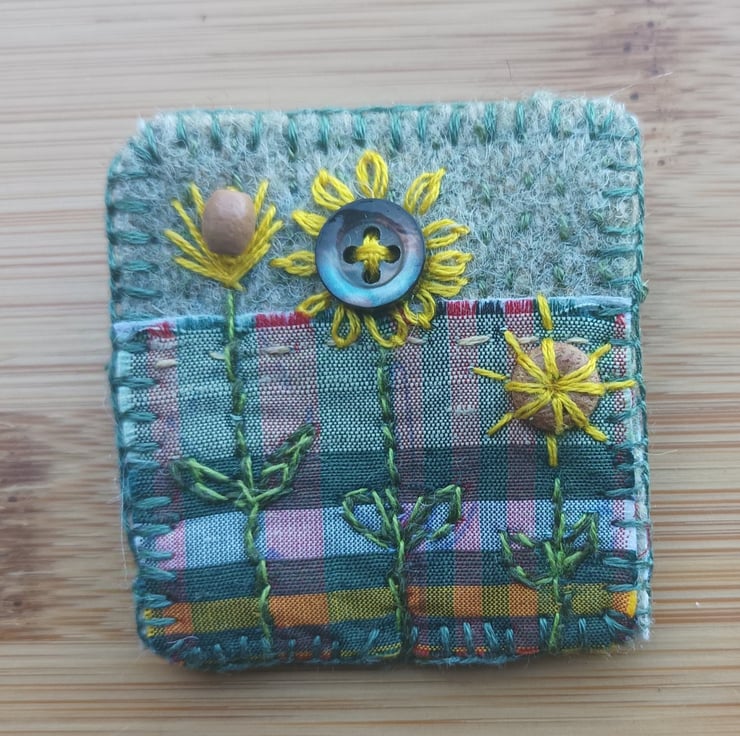 Upcycled eco gift. This hand stitched brooch is made from Silk and wool swatch fabric which would normally end up in landfill and found beads and buttons. Delicately embroidered with the addition of found beads. It comes with its own storage pouch to protect it. and is available in 3 colours.