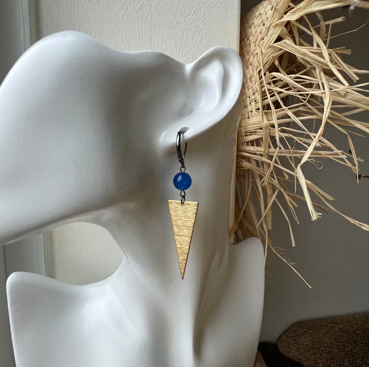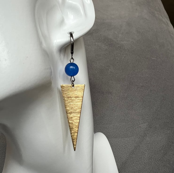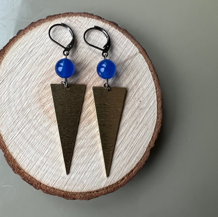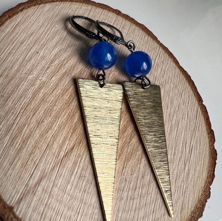 The brass triangle represents strength and transformation,while the royal blue jade bead-known for its calming and inspiring properties-brings clarity and peace.