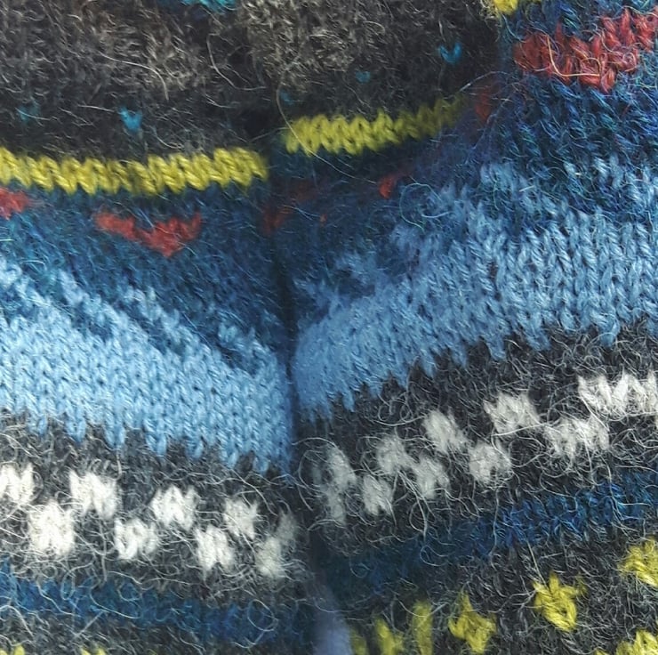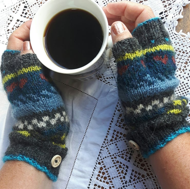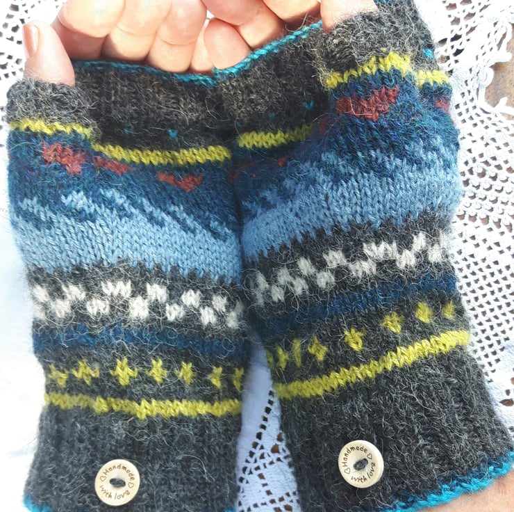 These fingerless mittens are hand knitted to my own design inspired by my button jar. They very are soft and warm. I have handknitted them on 4 needles to avoid unsightly seams and all loops on the back have been carefully knitted in. 100% alpaca which makes them luxurious and incredible warm and soft. One size as they are slightly oversized and stretchy.