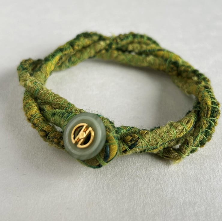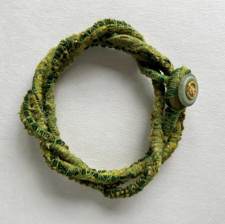 This lovely textile bracelet is made out of vintage fabrics and fine threads to look like mossy stones on Dartmoor.