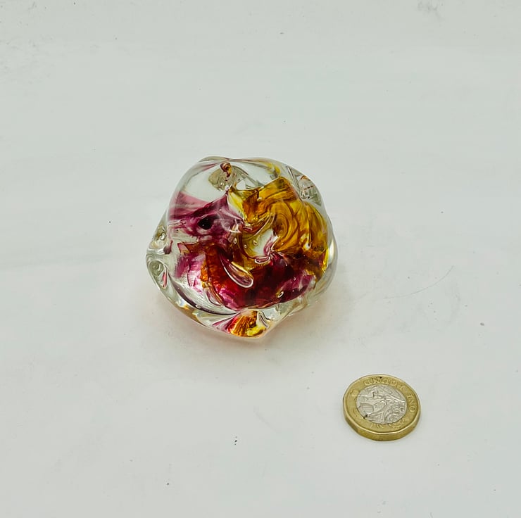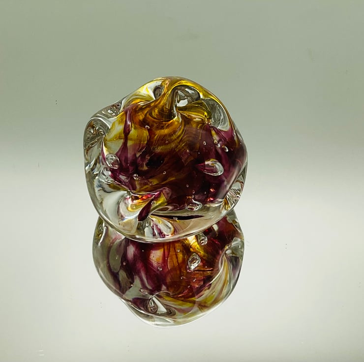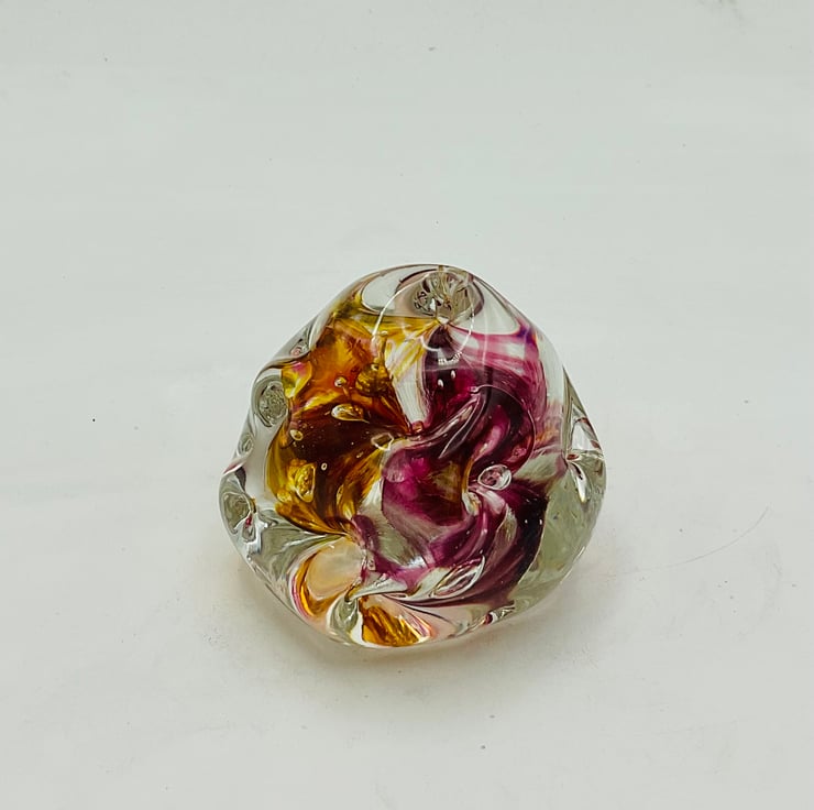 2024 has seen a revival in the joy of these little abstract works formerly known as paperweights . In today’s world there is not a lot of use for a paperweight but they are being seen in a new light . The marble syndrome and fascination for light colour texture and form has returned. It’s not all about the visual stimulus. One of my customers is loosing his eyesight and he asked me to make him some “tactile touchy feely “ objects so I give you the tweak weight …tactile and visually stimulating .