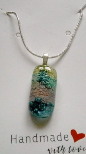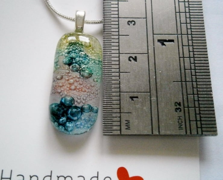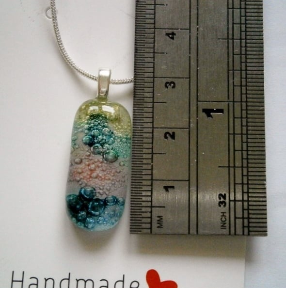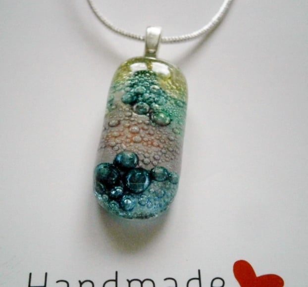 Due to the random effects of the powders used to create the bubbles this pendant is completely unique.
