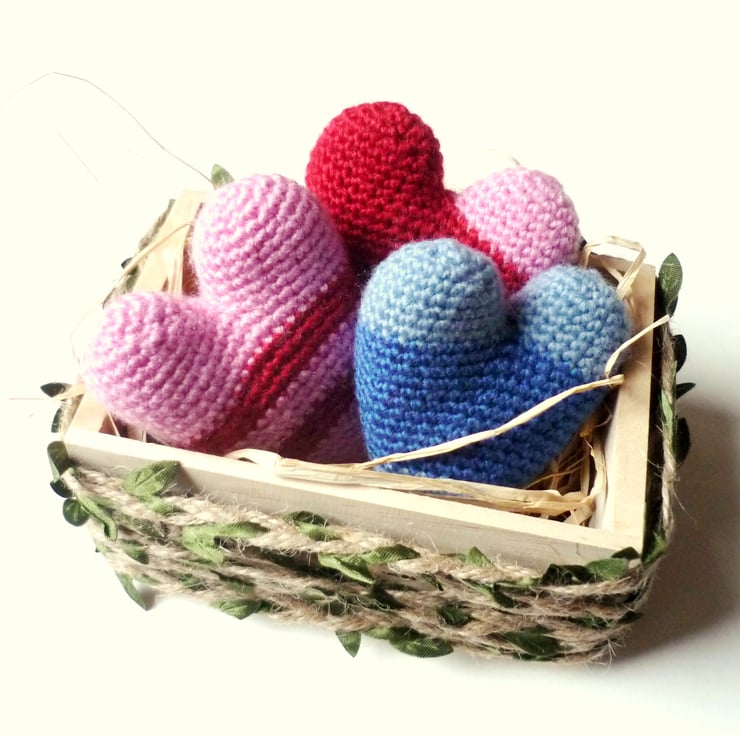 There are many ways to enjoy these colourful hand crocheted hearts.