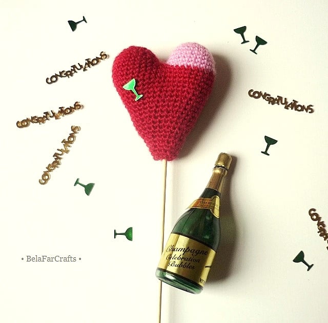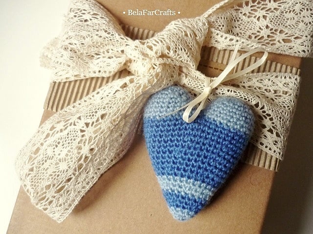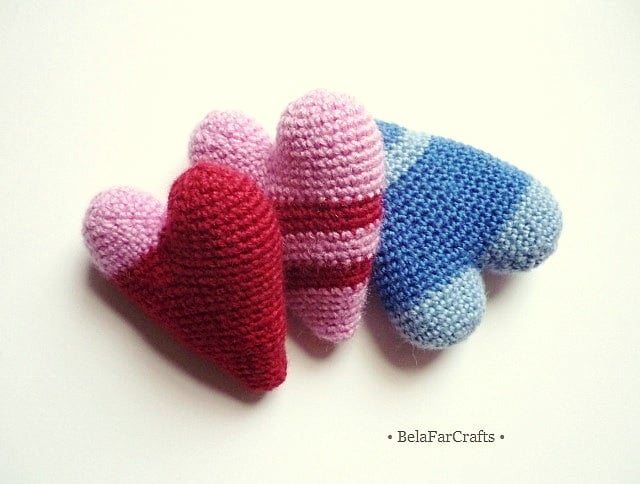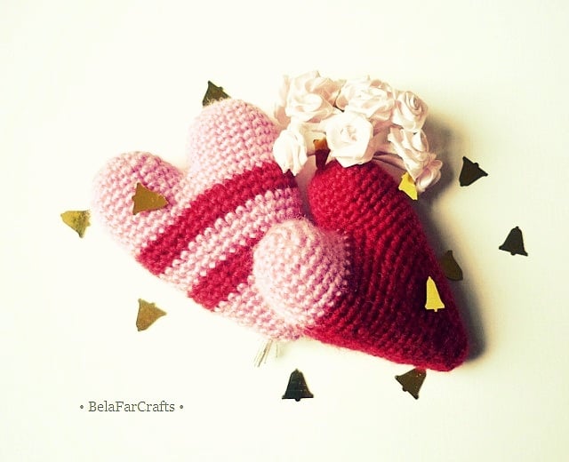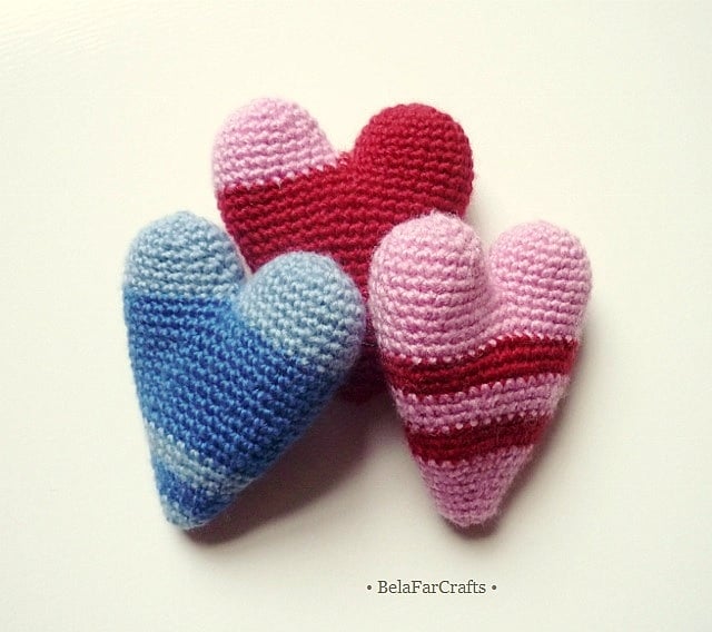 I create my hearts using wool or wool blend yarns and CE toy filling. They measure about 7cm x 8cm (3in).