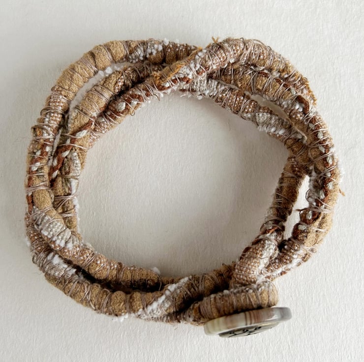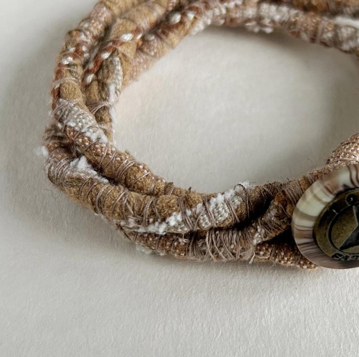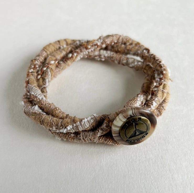 This lovely bracelet is made out of vintage textiles, handmade cord and fine threads.