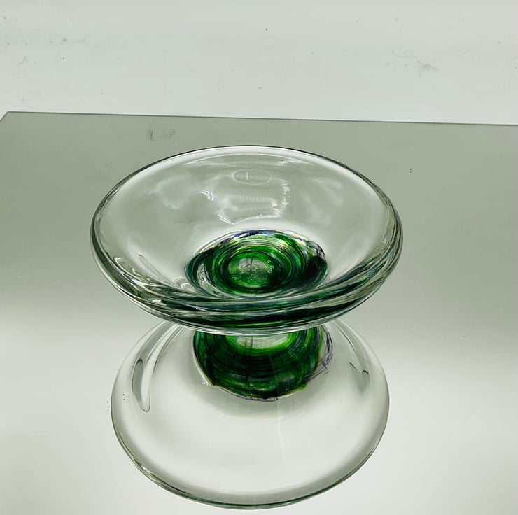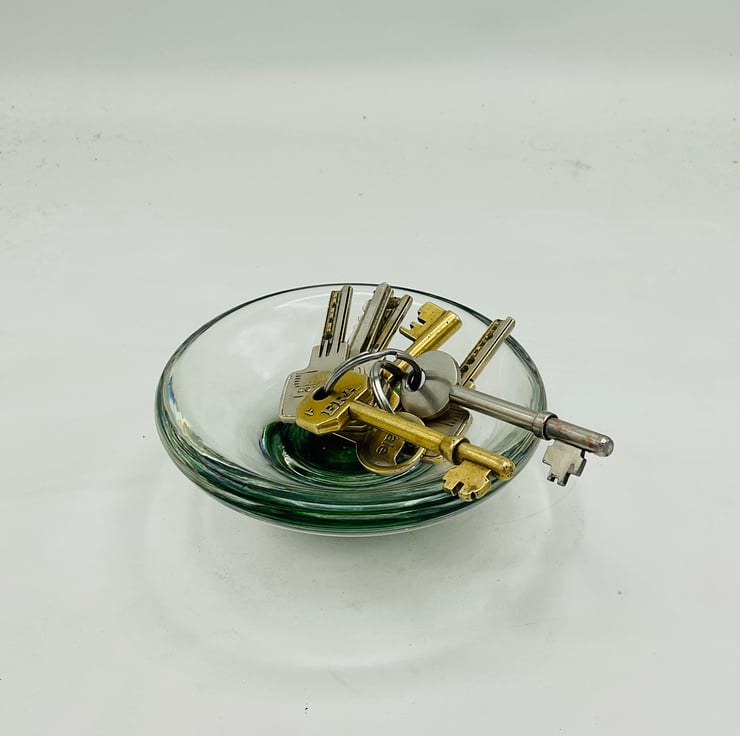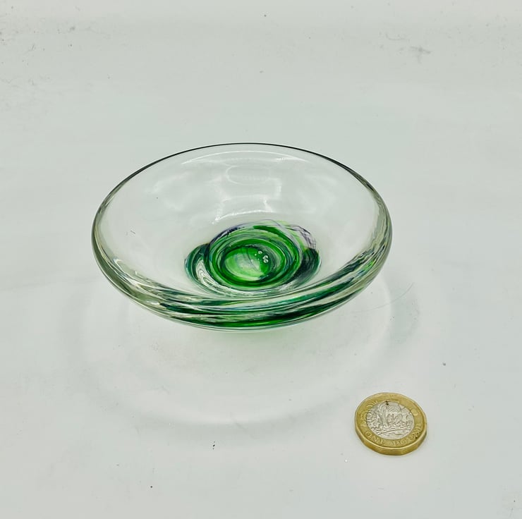 The joy of the medium that is glass. This is an example of one of the many reasons I have devoted my life to this magical material. There is a pool of blue and green in the bottom of the piece but it reflects onto the rim giving the illusion of a ring of colour. A lovely little stand alone piece or perfect for earrings or keys .
