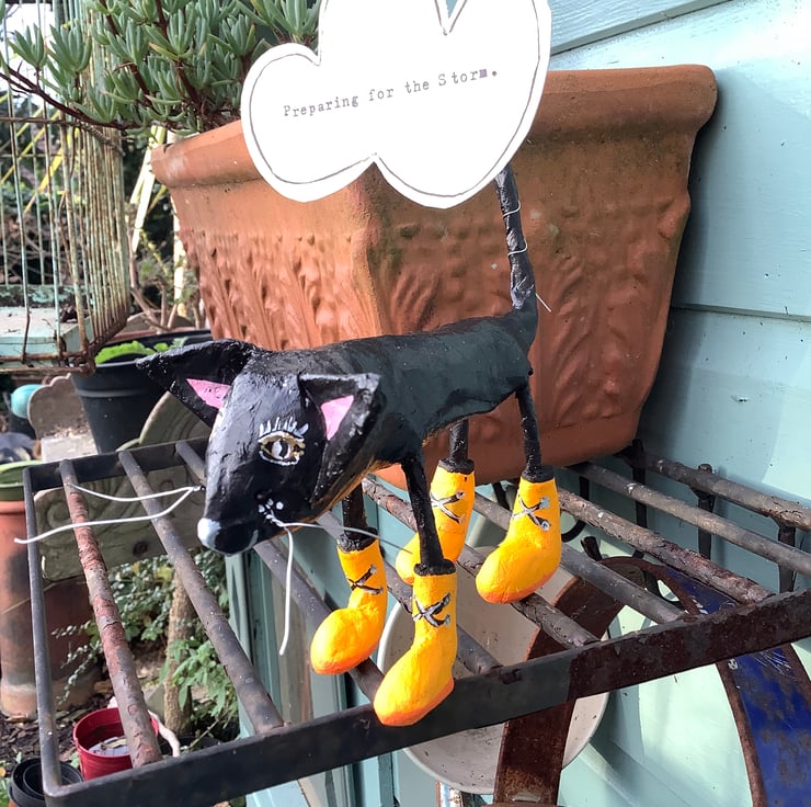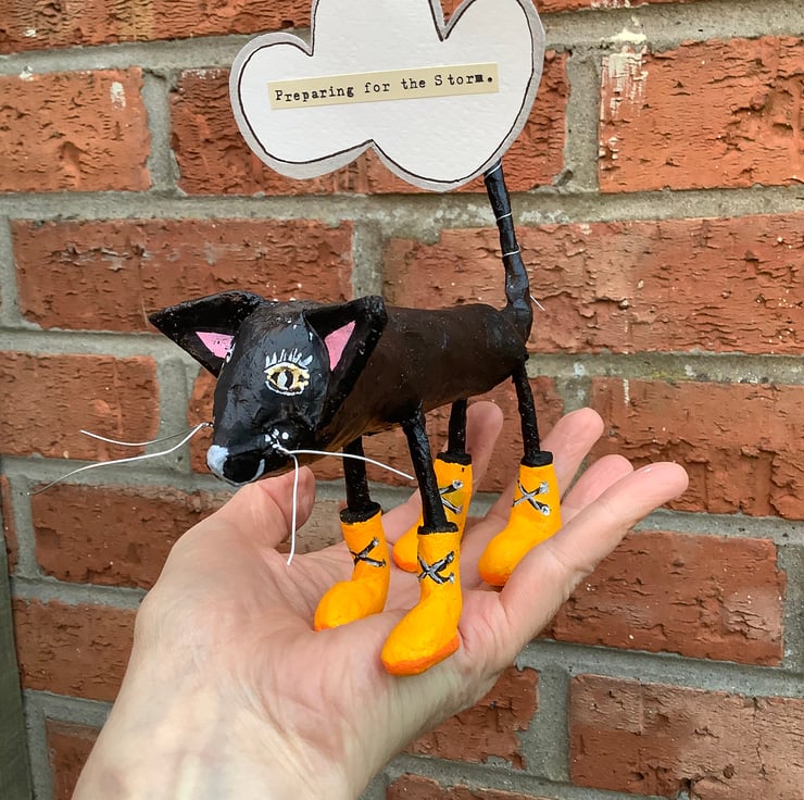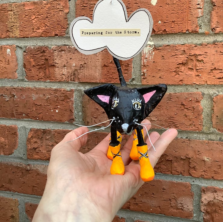 This lovely little cat sculpture has been made from papier-mâché. He is hand painted and decorated. He is all ready for the storm because he is wearing his yellow welly boots. The cloud above is made from card and reads’ Prepared for the Storm’. This is a totally unique sculpture. I hope it makes you smile.