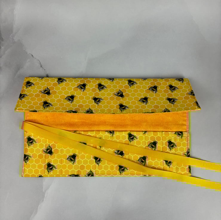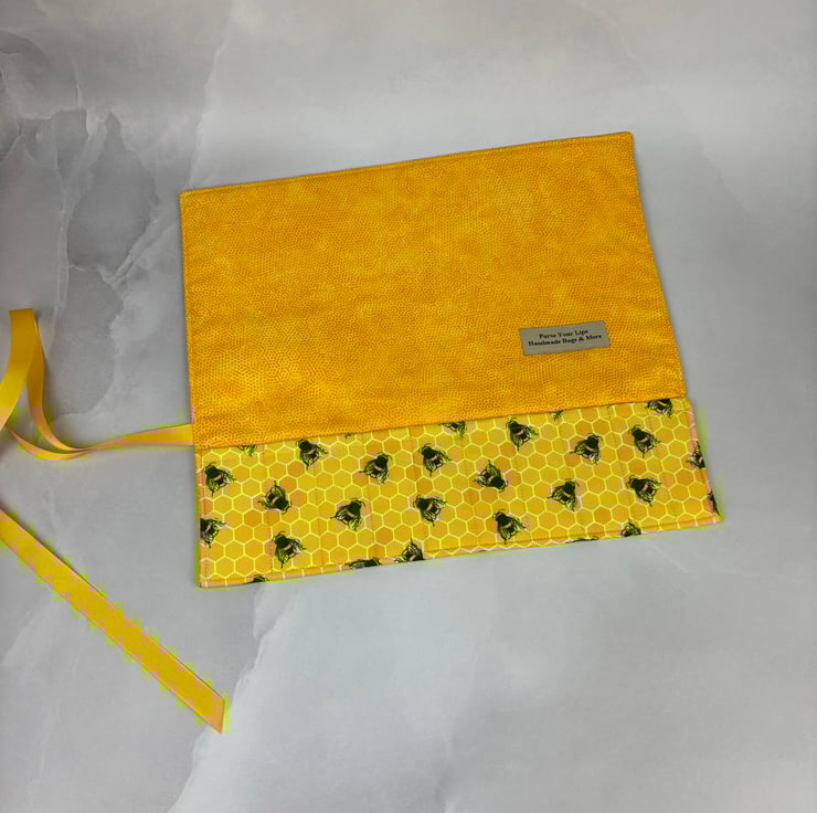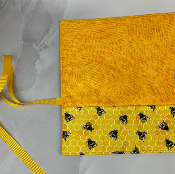 This versatile tool roll has 10 pockets and 2 long yellow grosgrain ribbon ties.