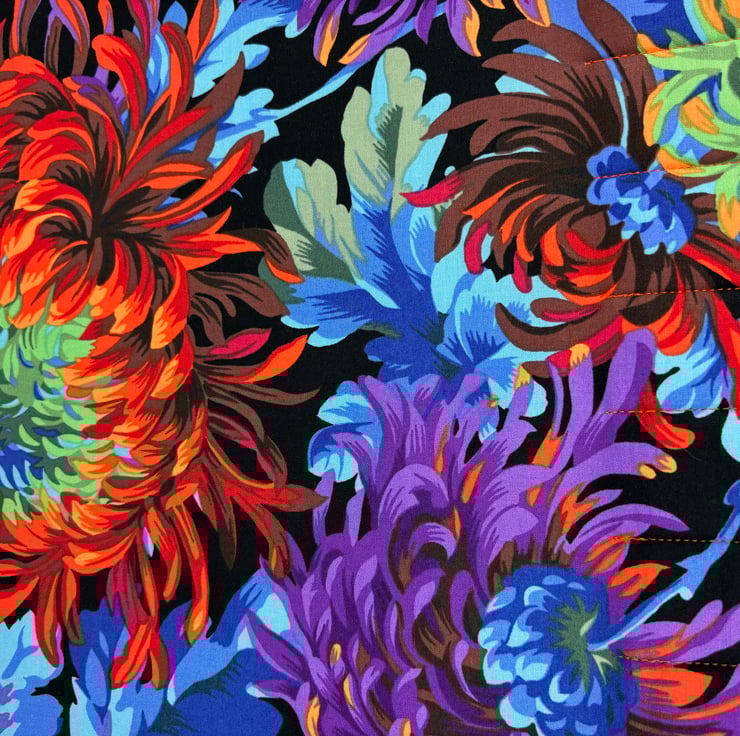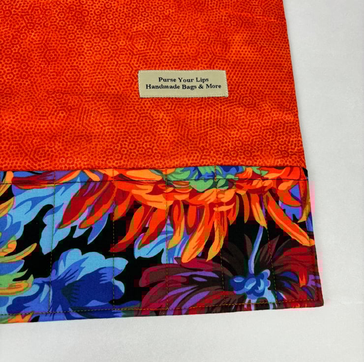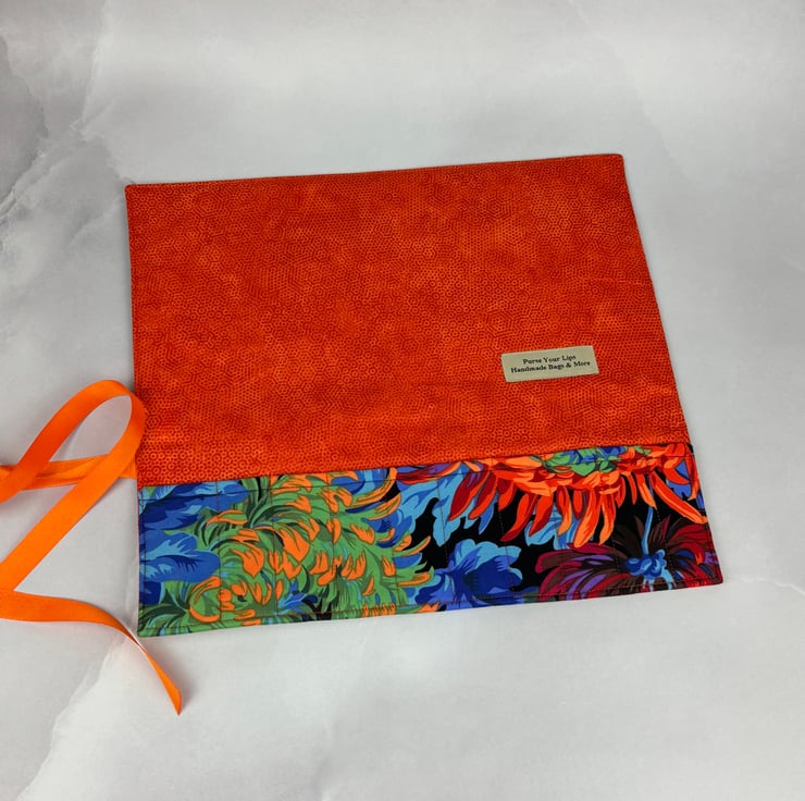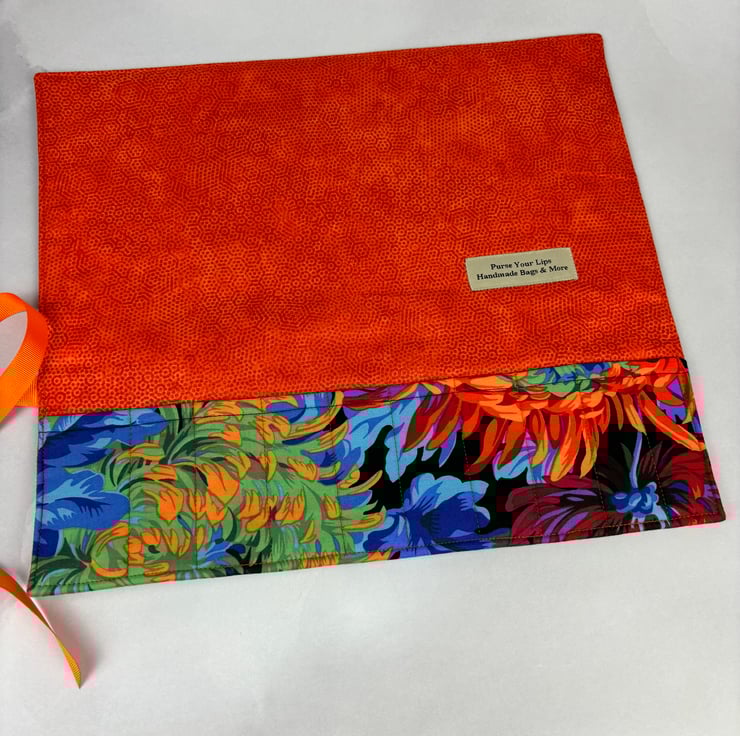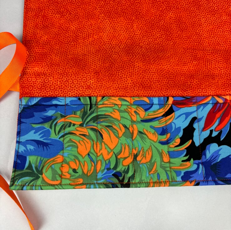 Handmade fabric tool roll in a stunning bold chrysanthemum flowers cotton fabric and lined in a rich orange cotton.
