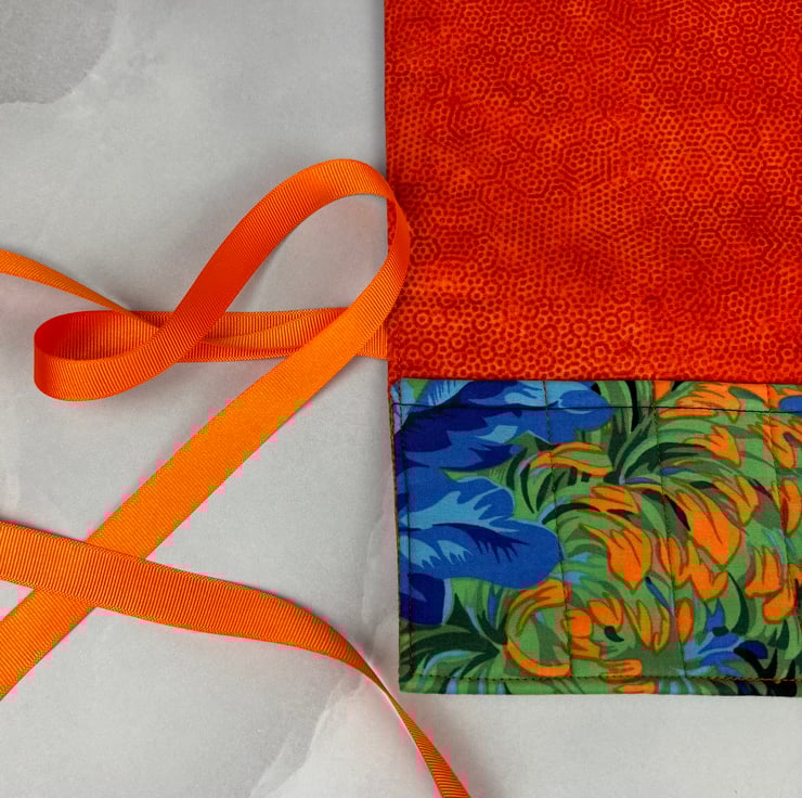 This versatile tool roll has 10 pockets and 2 long orange grosgrain ribbon ties.