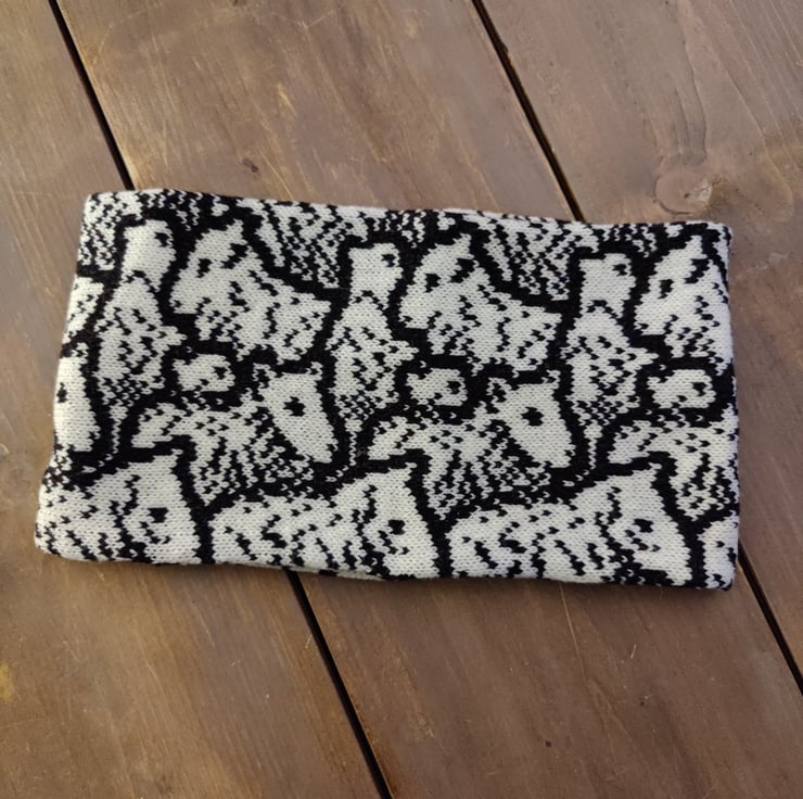A flock of sheep snood / cowl / infinity scarf. Part of my fun animals collection. This cosy cowl is doubled over trapping in the air to keep you warm, but also helping to wick. Knitted with a super soft lambswool spun in Scotland.