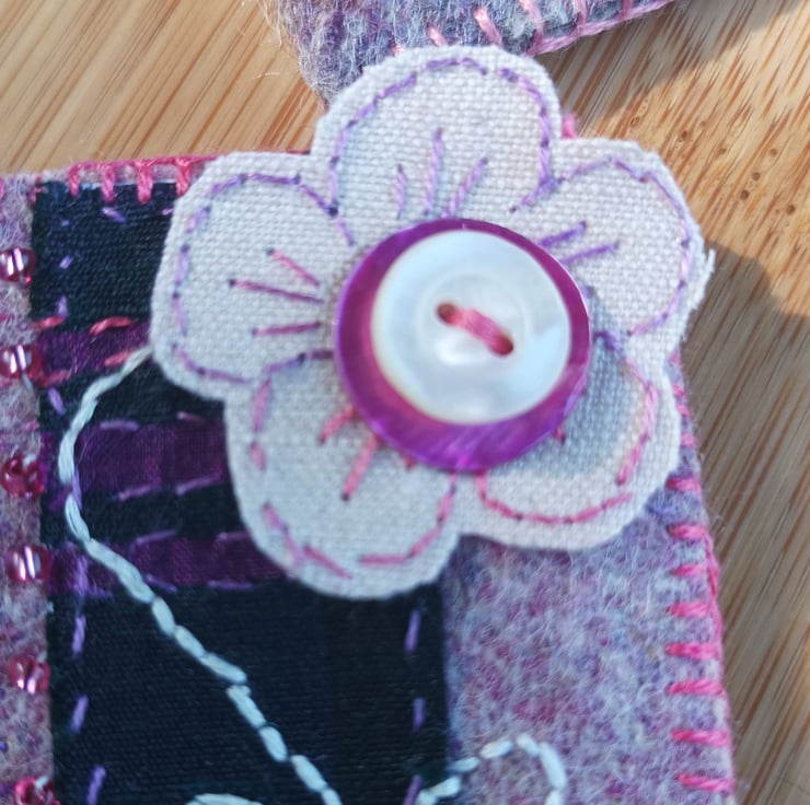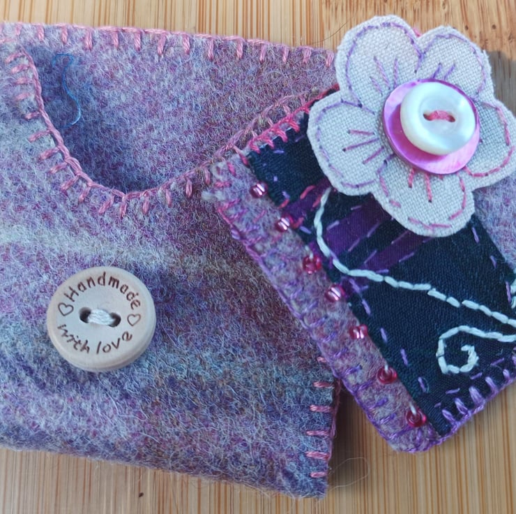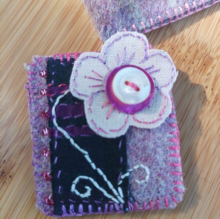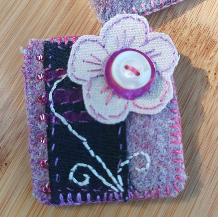 Hand stitched upcycled brooch in silk tartan, linen and found beads. Created from Swatch silk tartan and wools fabric which would normally end up in land fill. Embellished with small beads, silk thread and a small button. It comes in its own storage pouch to protect it.