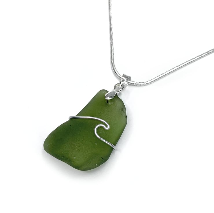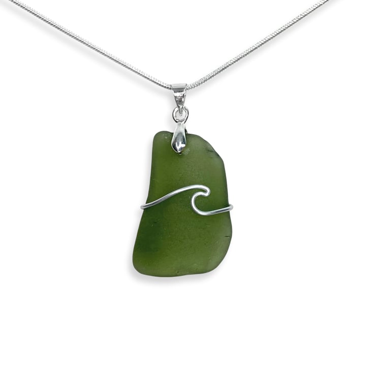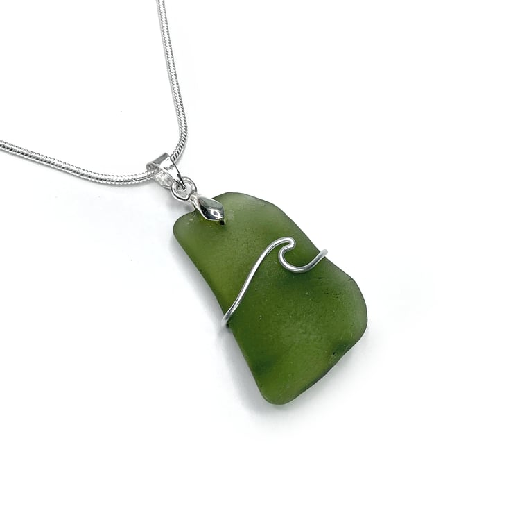 Sea Glass Necklace - Olive Green Wave Wire Wrapped Pendant - Scottish Silver Jewellery