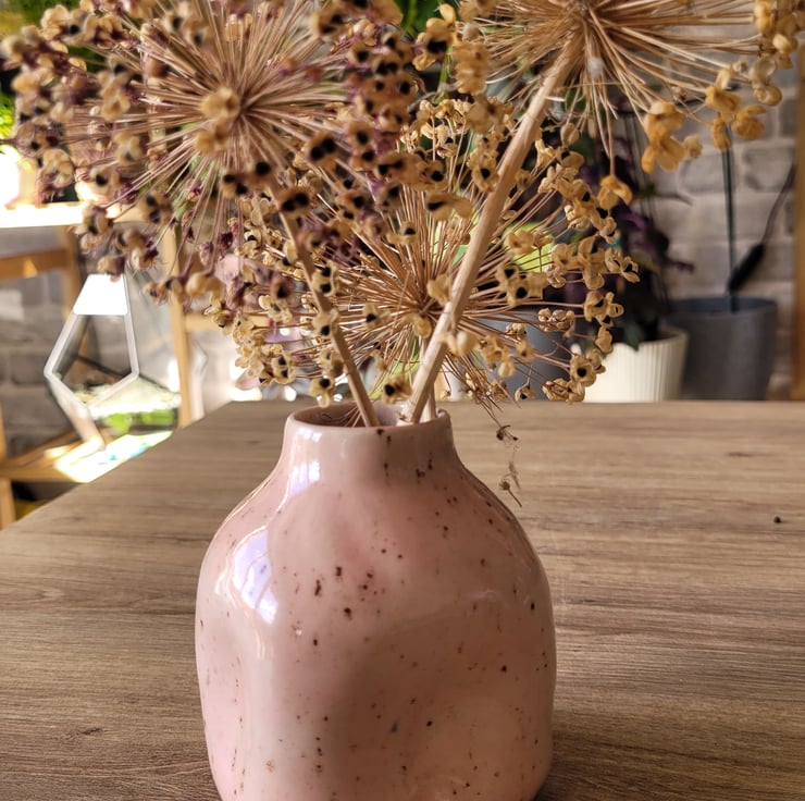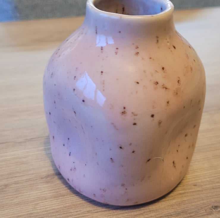 Handmade small bud vase. Thrown on the pottery wheel and altered by hand the vase is a rounded square shape with indented sides. A gorgeous speckeld pale pink glaze externally with a white glaze internally. This item is 9cm tall from base to the top of the lip of the vase.