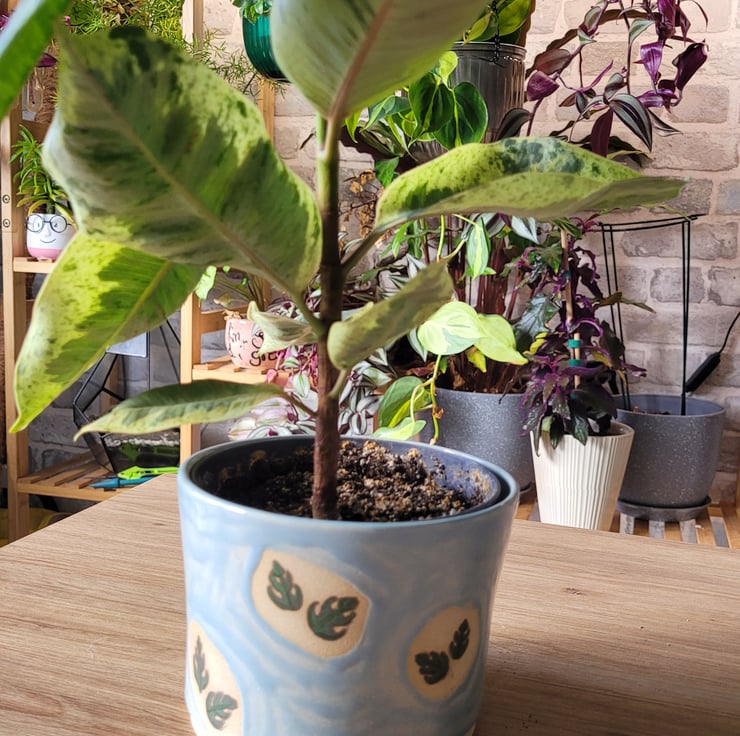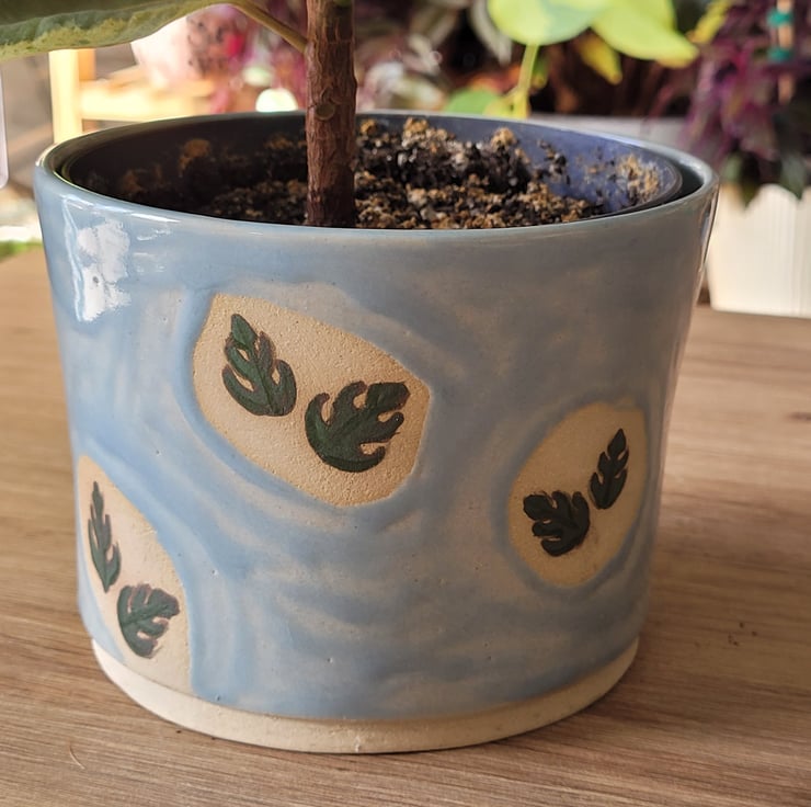 Thrown on the pottery wheel, this plant pot is decorated with hand painted monstera leaf detail and glazed with a pale blue glaze. This plant pot also had a drainage hole so plants can be planted directly into it if you wish. This item is 12.5cm in diameter and is 9cms in height