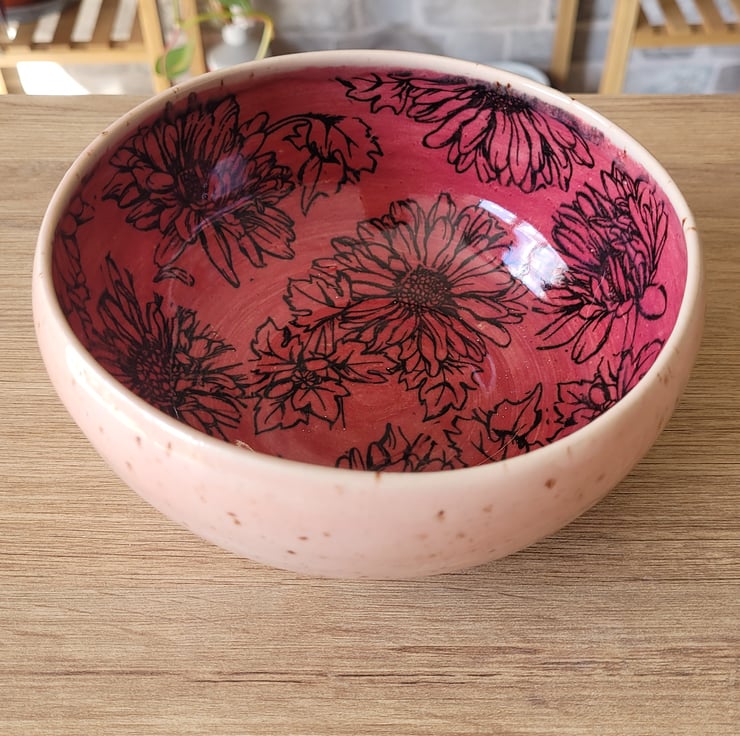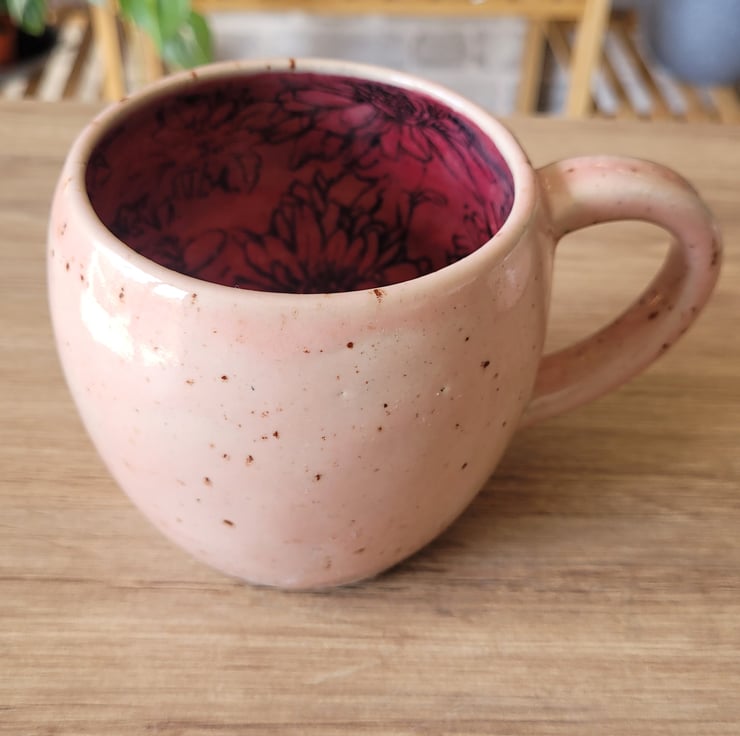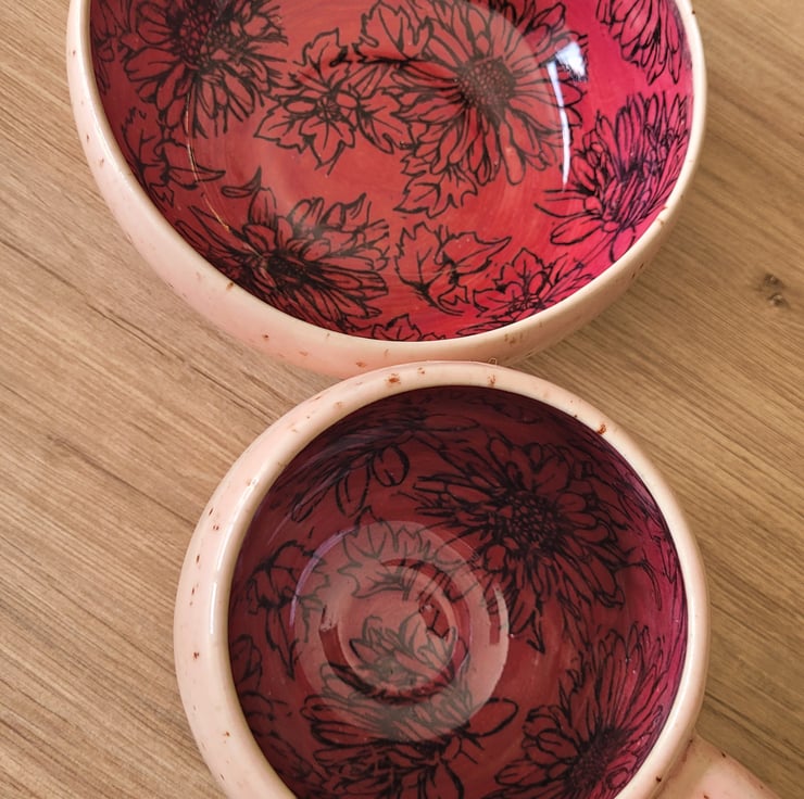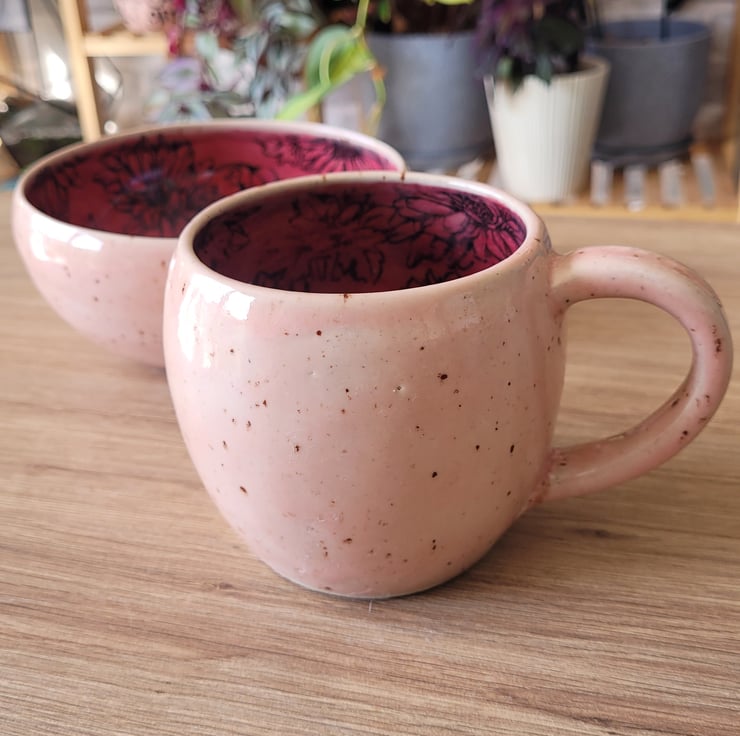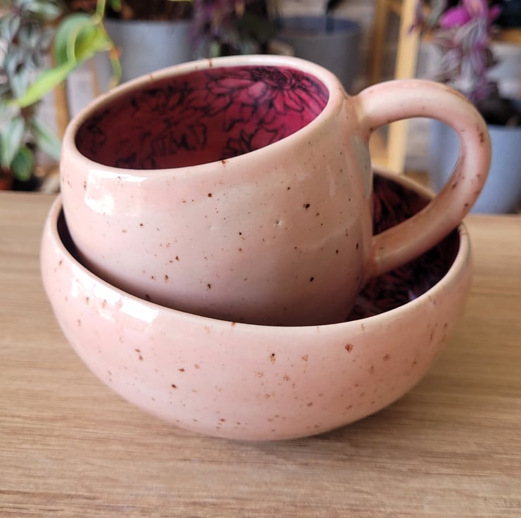 Thrown on the pottery wheel this breakfast set includes a mug and cereal bowl both in matching glaze and pattern detail. The outside glaze is a speckled pale pink and the inside is a deeper pink with a printed flower pattern. The mug has a capacity of approximately 350ml and the bowl is 13cm in diameter.