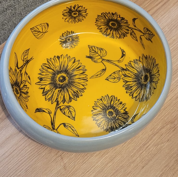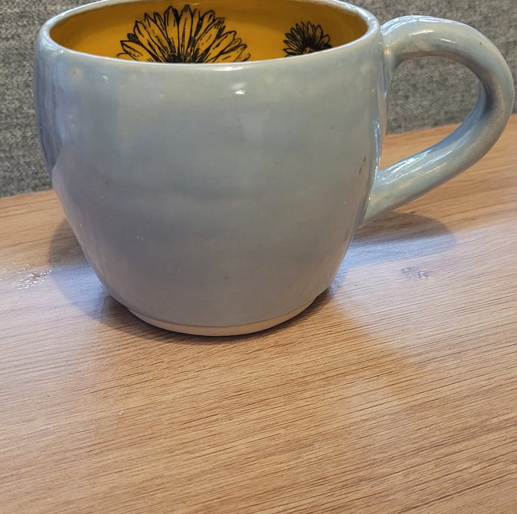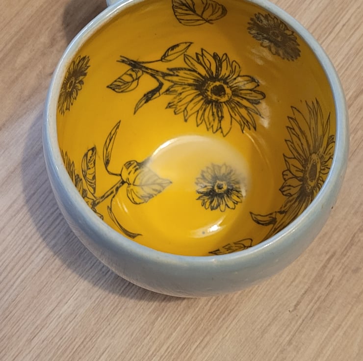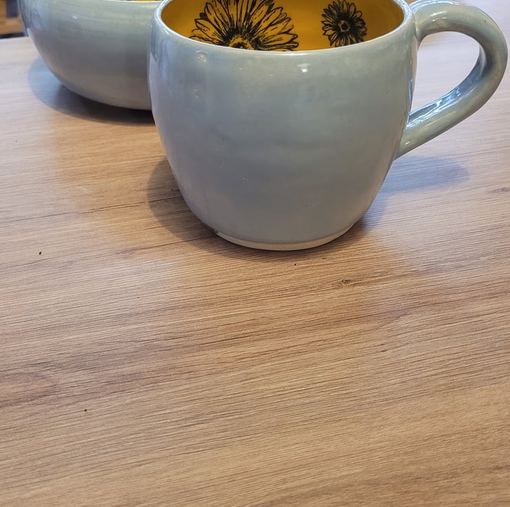 Thrown on the pottery wheel this breakfast set includes a mug and cereal bowl both in matching glaze and pattern detail. The outside glaze is a pale blue and the inside is a bright yellow with a printed sunflower pattern. The mug has a capacity of approximately 350ml and the bowl is 14cm in diameter.