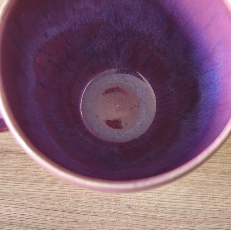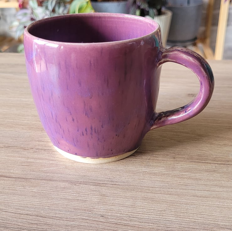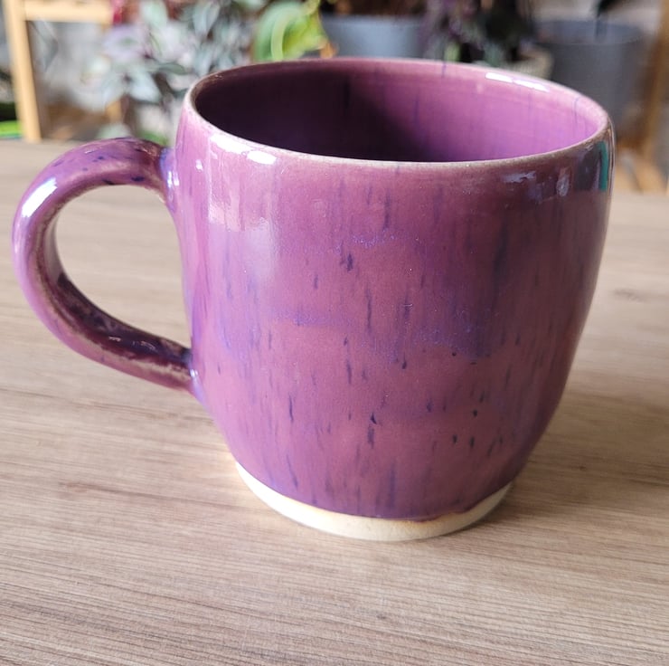 This wheel thrown item has a deep purple speckled glaze on both the inside and outside surfaces. This mug has a capacity of approximately 300ml.