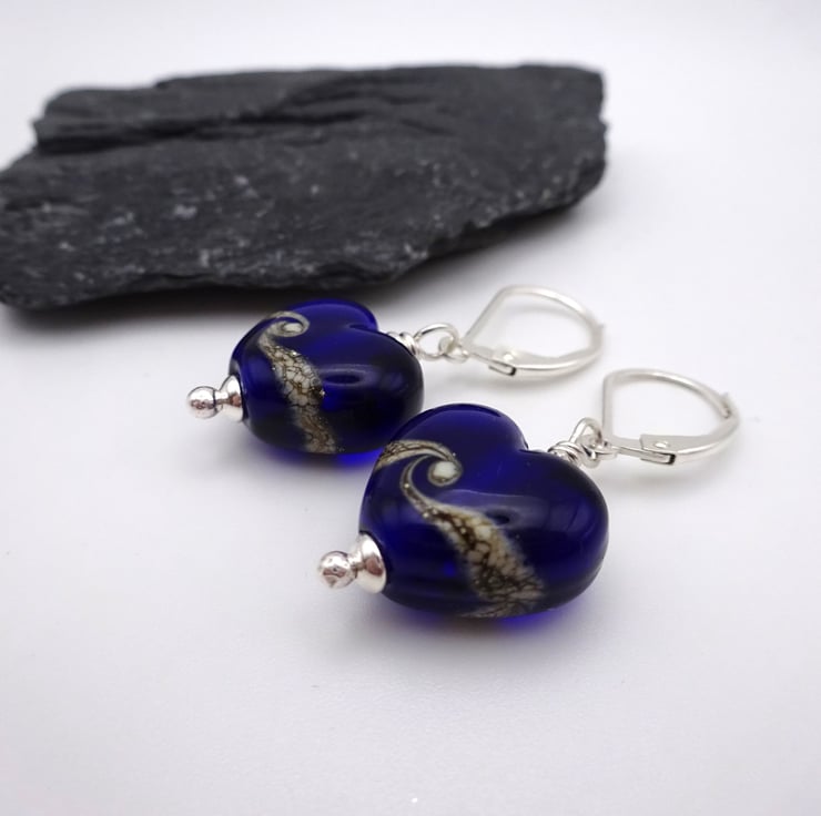 They feature sterling silver lever back ear wires, sterling silver beads and handmade lampwork glass heart beads.