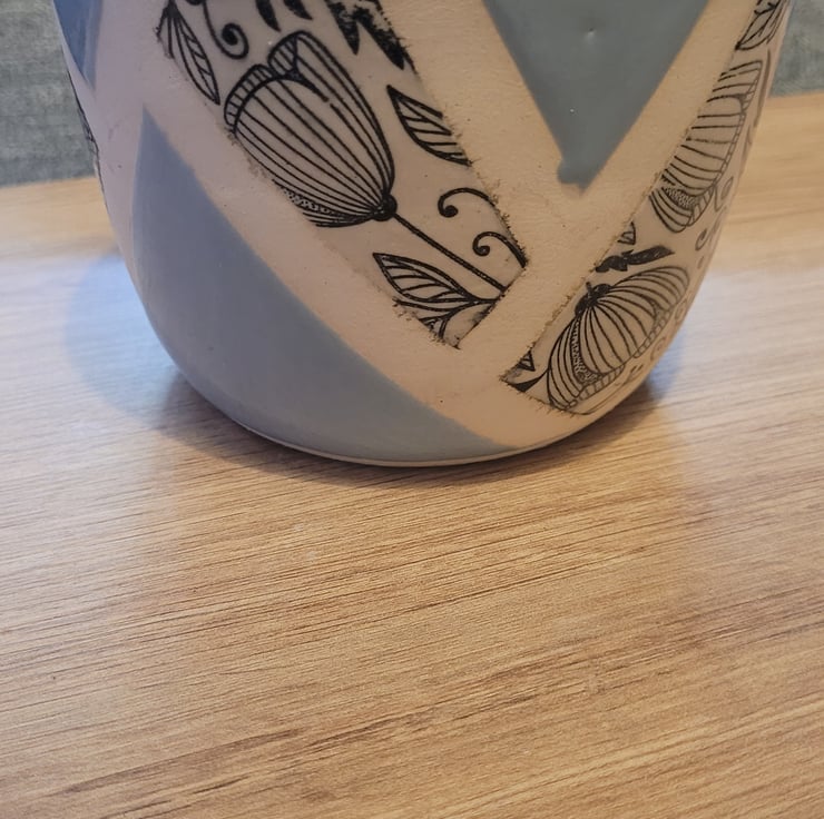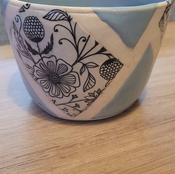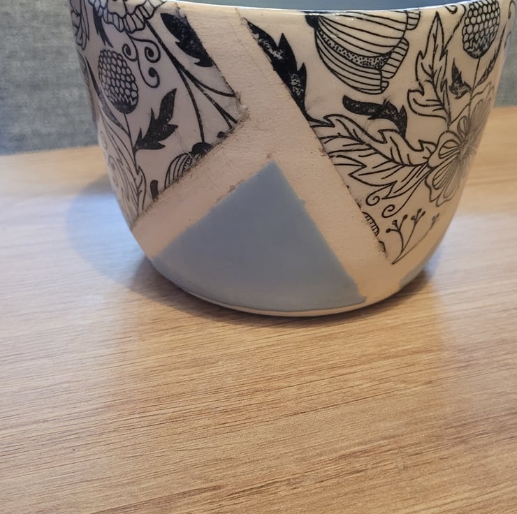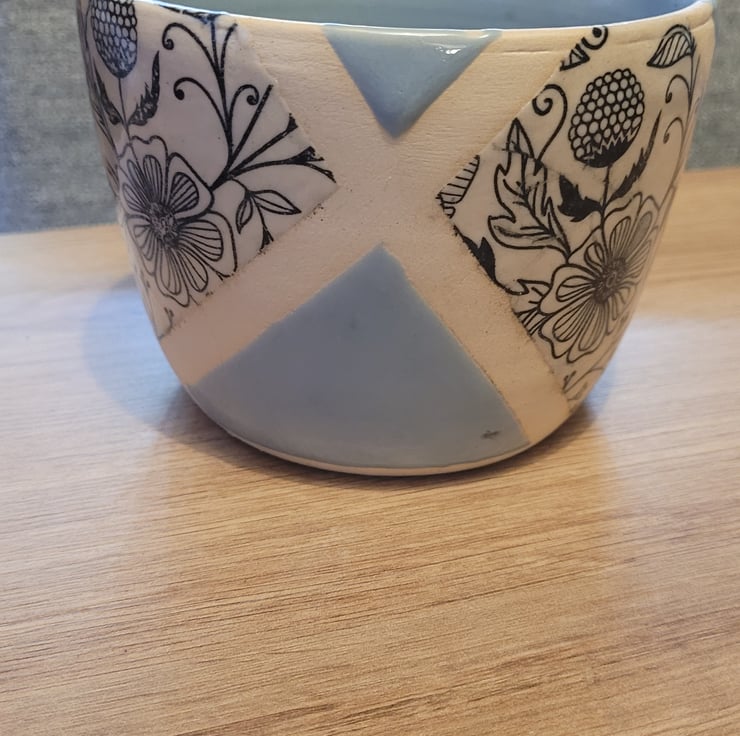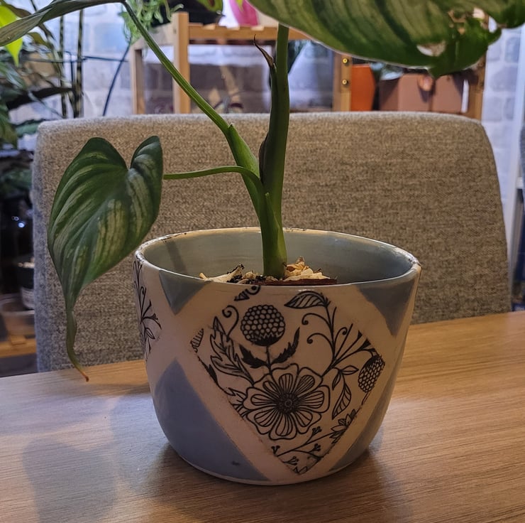Thrown on the wheel this plant pot is glazed with a pale blue glaze on the inside and a sectioned outer surface with the same pale blue glaze and a printed flowery pattern. This item has a diameter of 12cm and a height of 9cms.