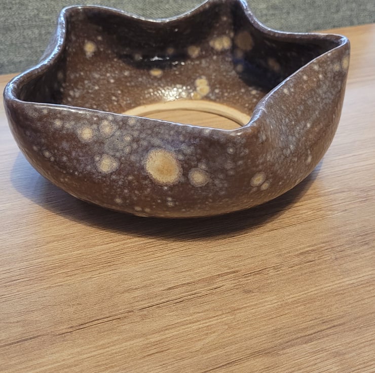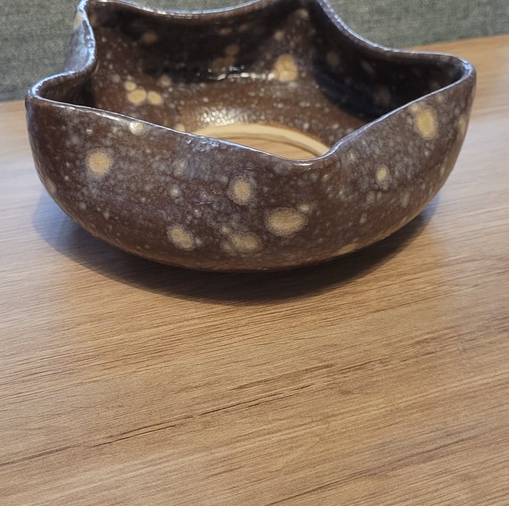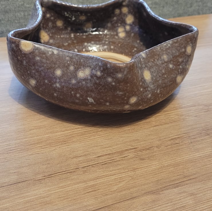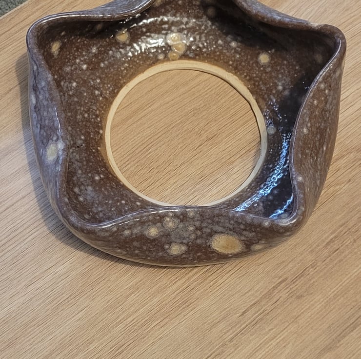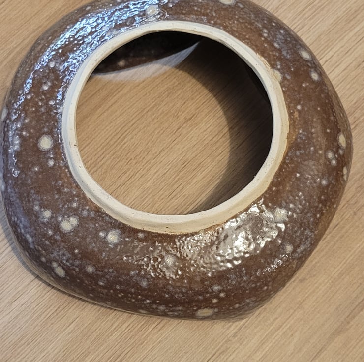 Thrown on the wheel and then altered by hand, this planter has a large drainage hole in the bottom so that anything planted in it directly does not get waterlogged. Place a piece of mesh or a crock over this before planting. Alternatively use a nursery pot. This planted has a height of 5.5cm and a diameter of 15cm. The flaze is grey with a craterlike effect across both inside and outer surfaces.