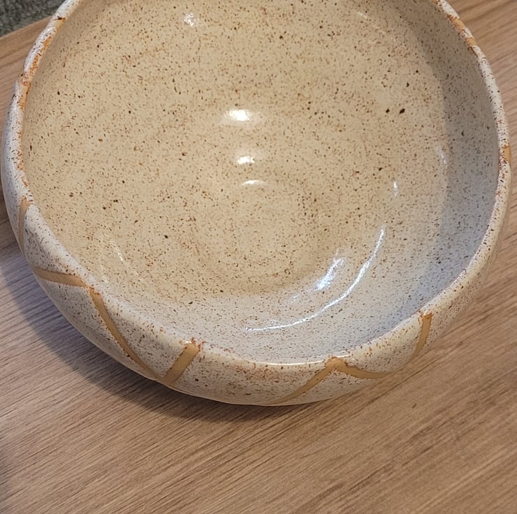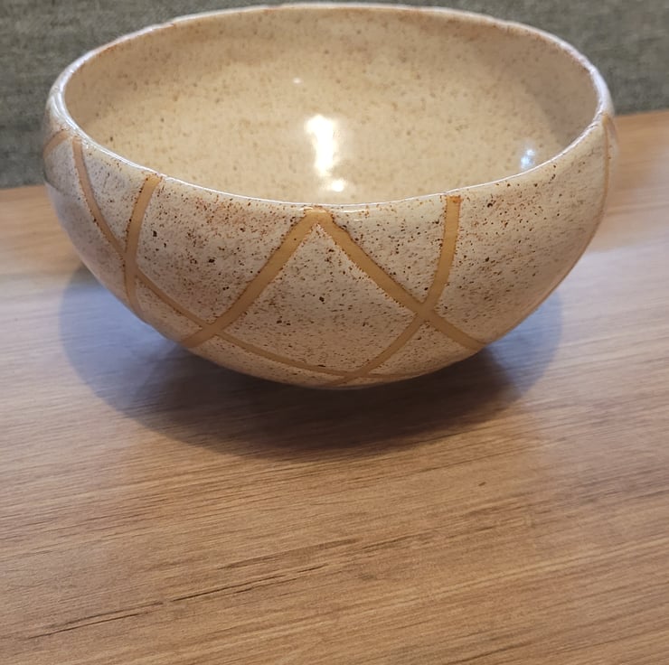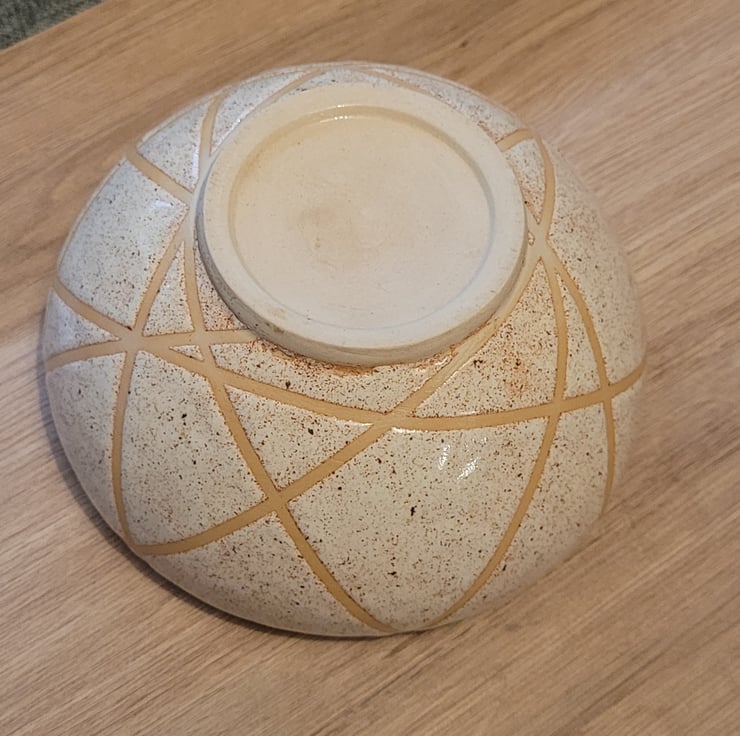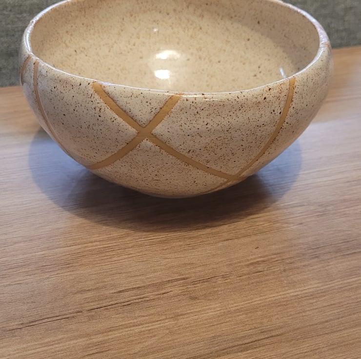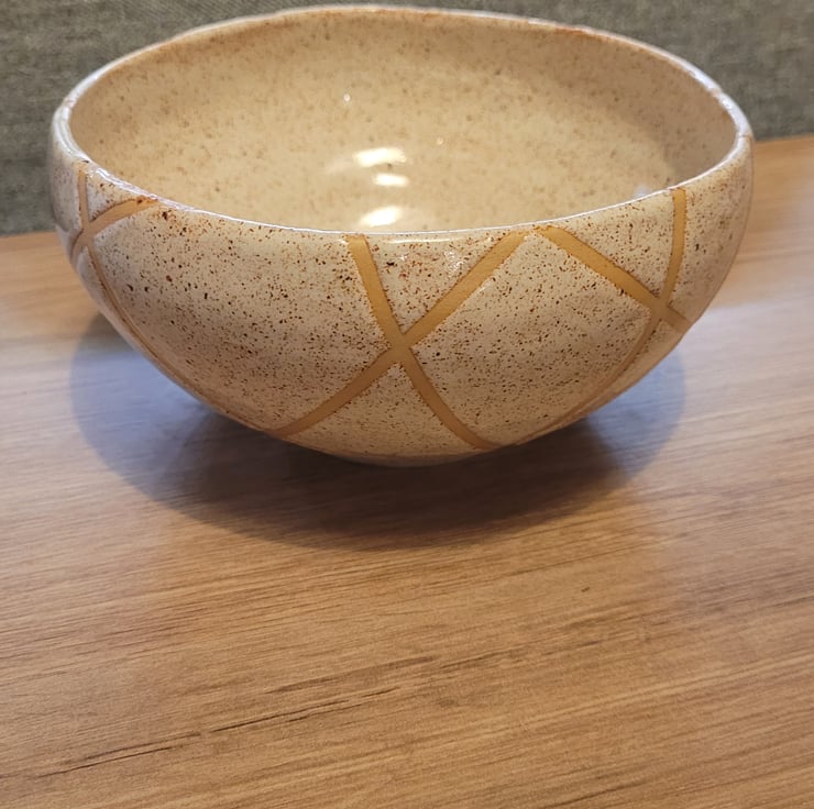 Thrown on the wheel this bowl has a cream speckeld glaze over both the inside and outer surfaces. The outside is in a geometric pattern. The bowl has a diameter of 15cm and a height of 9cm.