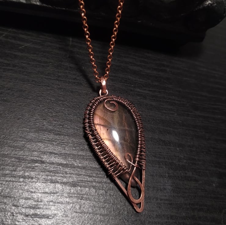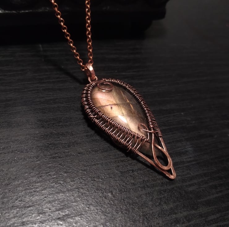 Hand-woven pure copper pendant featuring a beautiful labradorite. The stone has unusual peachy pink coloured fire. Finished with jeweller's wax to prevent tarnish. It hangs on an 18" long copper coloured chain necklace.