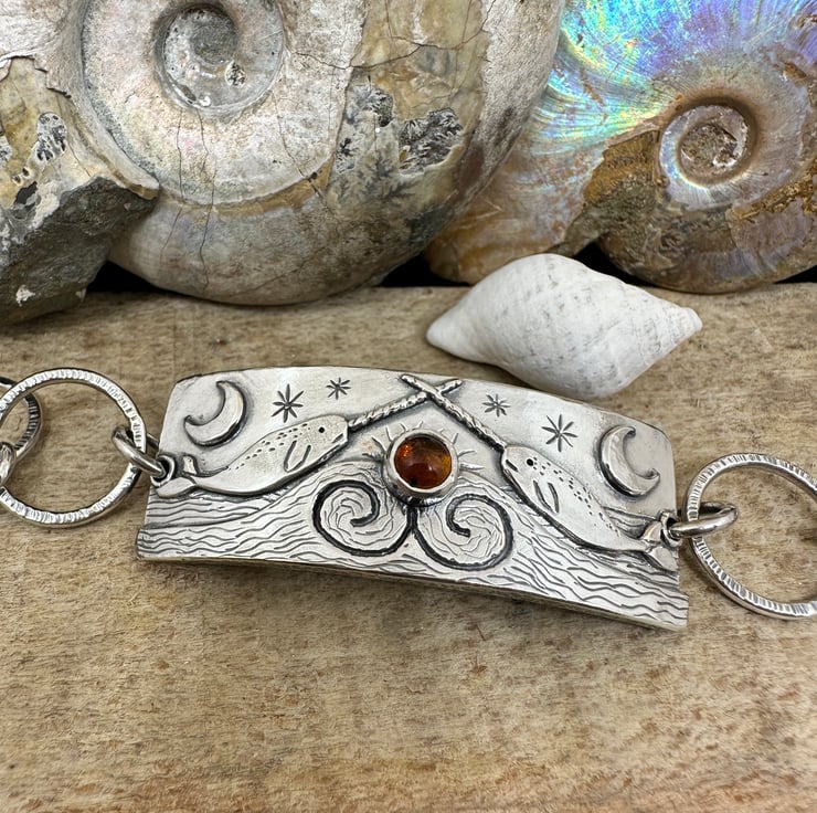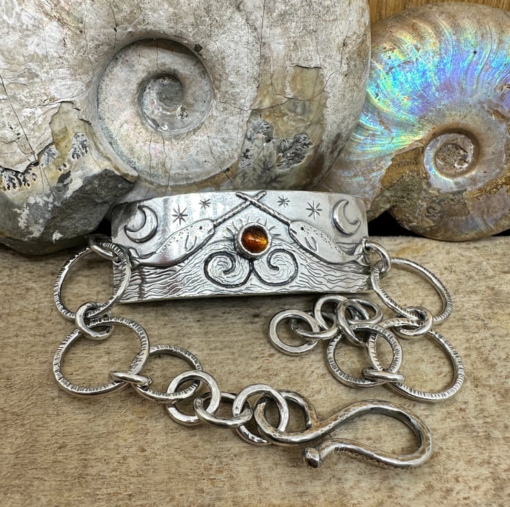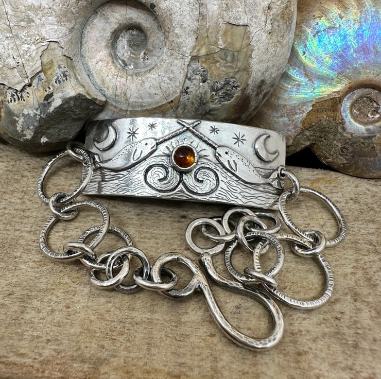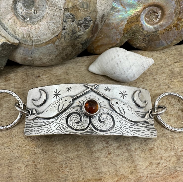 A silver narwhal bracelet with shepherds hook fastening, inspired by my scenic bangles.