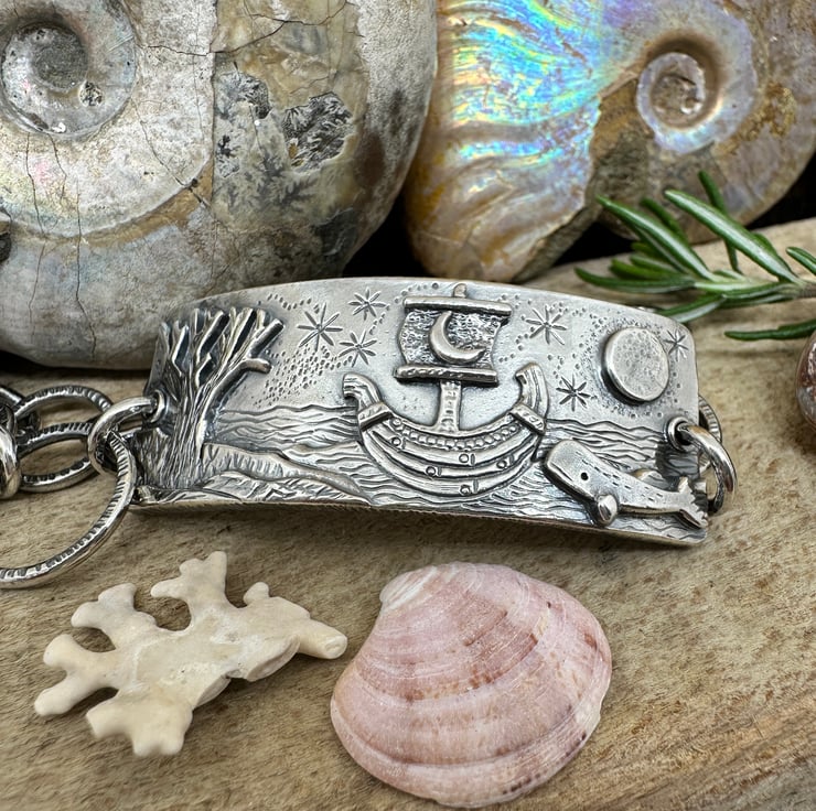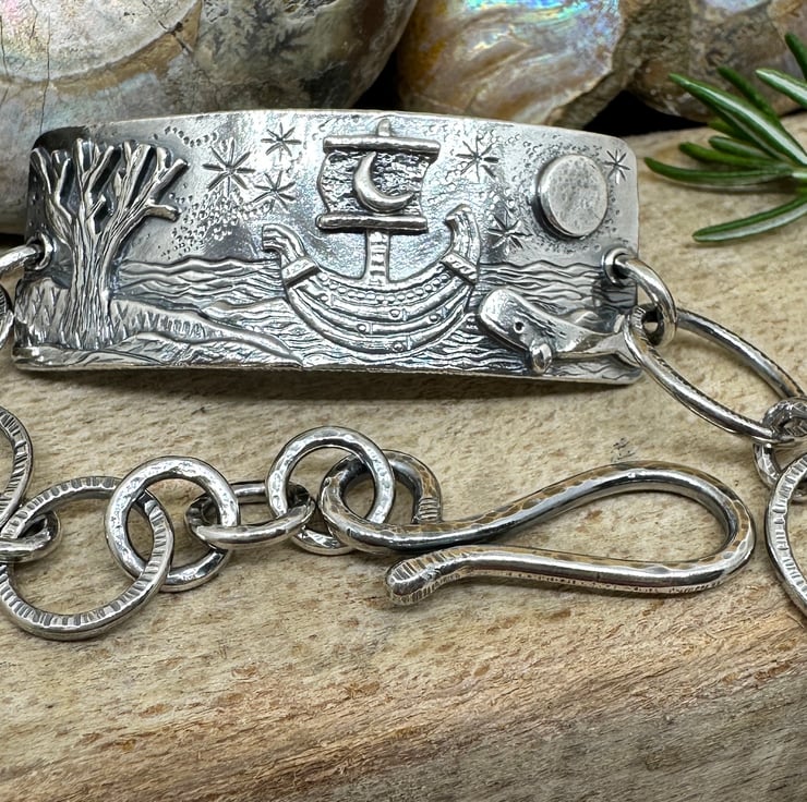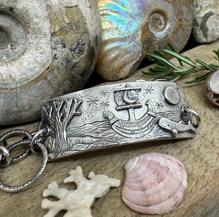 An ancient ship and whale bracelet with shepherds hook fastening, inspired by my scenic bangles.