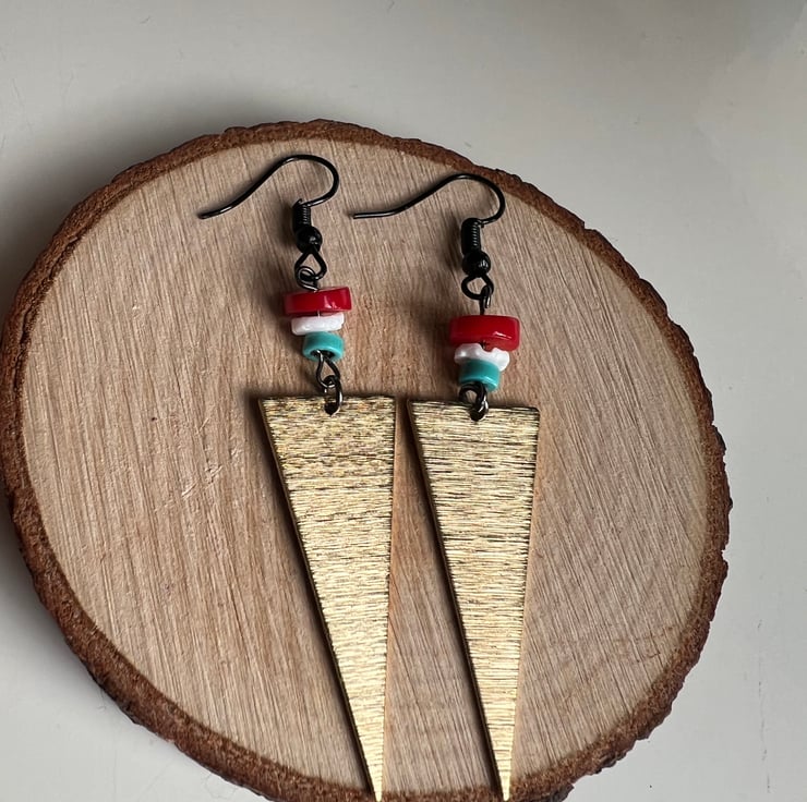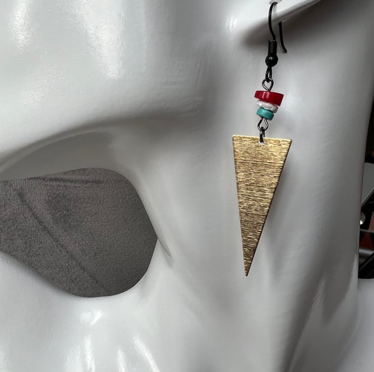 These are complemented by a golden brass triangle brass,adding a geometric flair and a black fish hook earwire ,ensuring a comfort and a modern finish.