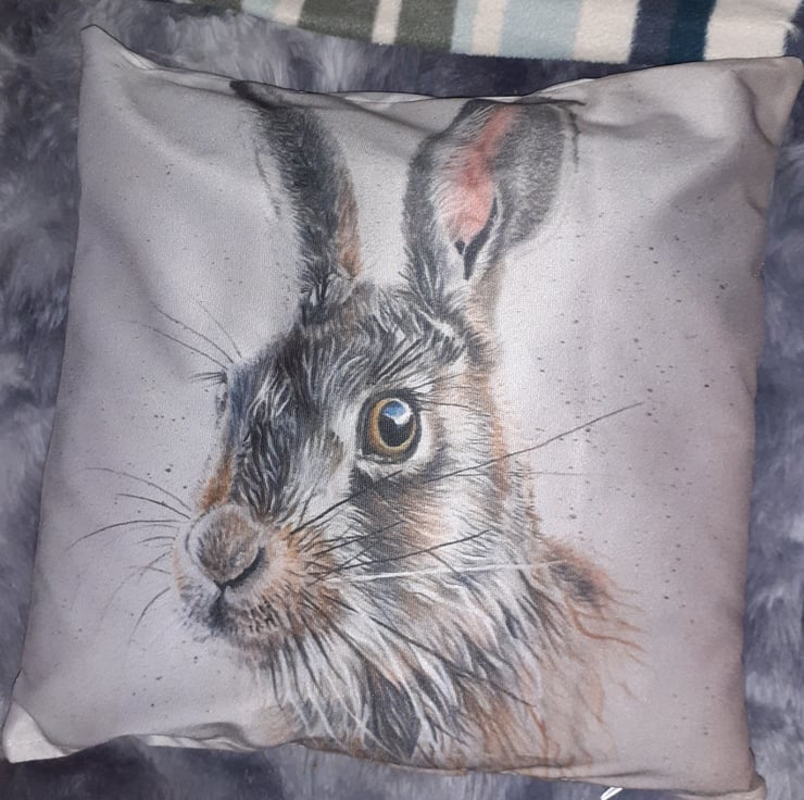 hare print on the cushion double sited size 35.6 cm -35.6 cm, it is easy to take cover off and wash as there is zip