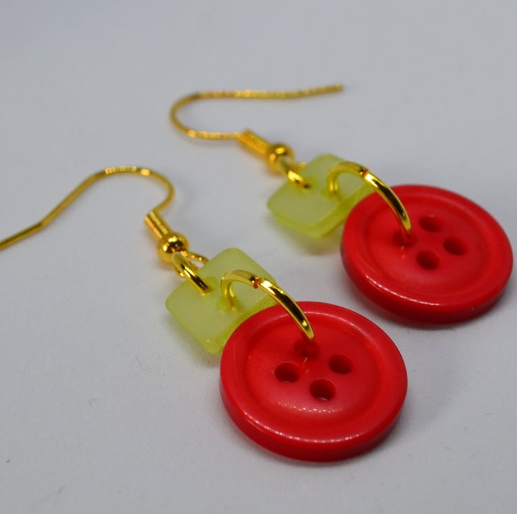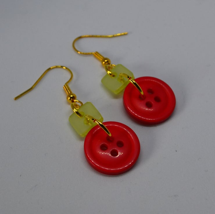 These lovely lightweight button earrings are made using acrylic buttons and gold plated findings. The square buttons are a lime green colour and the red buttons at the bottom are approx. 1.5cm wide. The overall drop of the earrings are approx. 2.8cm from the base of the ear wires.