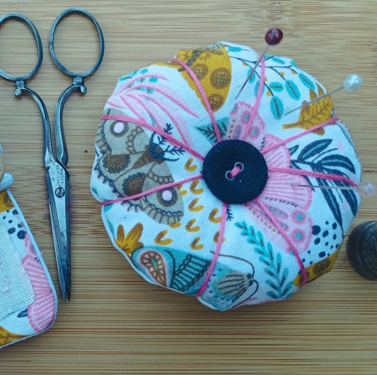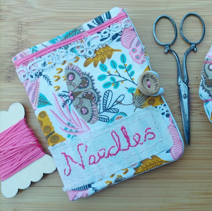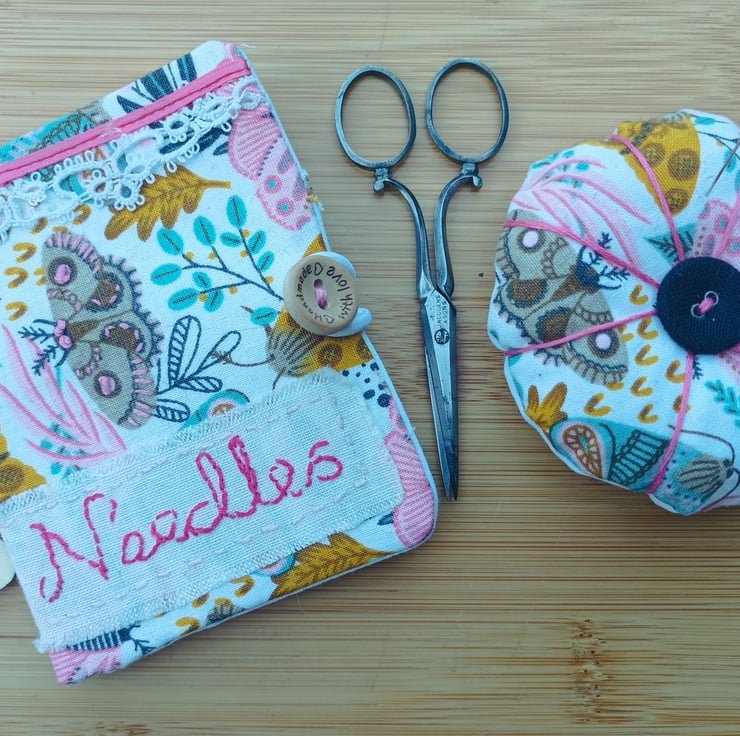 Hand finished needlecase and matching pin cushion finishes with hand sewn detail. Made from sewing scraps and found ribbon. The pin cushion is filled with ground walnut shell to condition your needles as you use it. This beautiful set would look great in any craft space as well as being very useful. SCISSORS ARE NOT INCLUDED.
