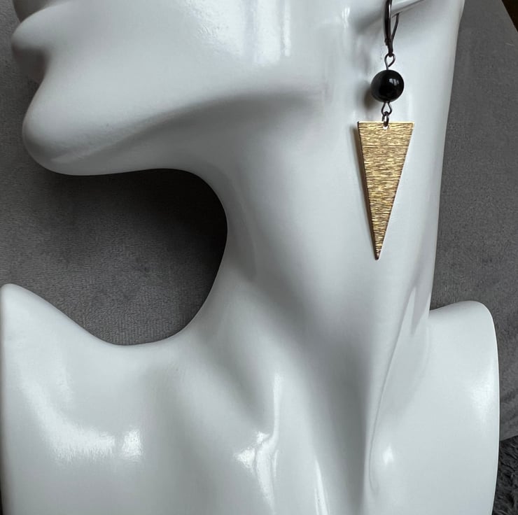 These stylish earrings combine brass triangle charms with smooth onyx gemstone beads for a bold yet classy look.