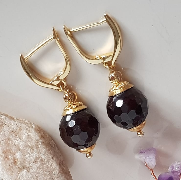 The earrings are decorated with natural garnet beads 12 mm in diameter.