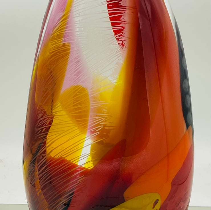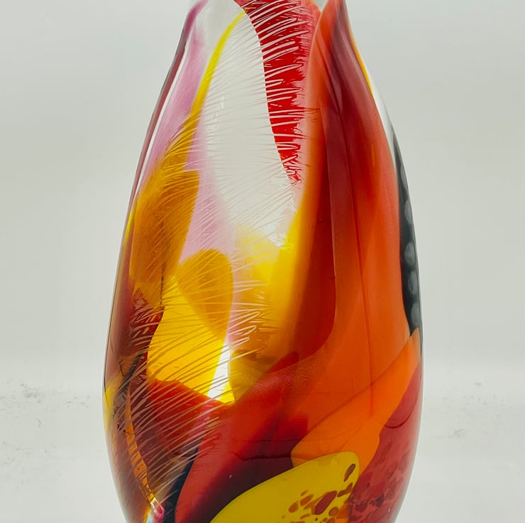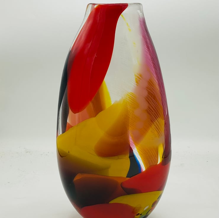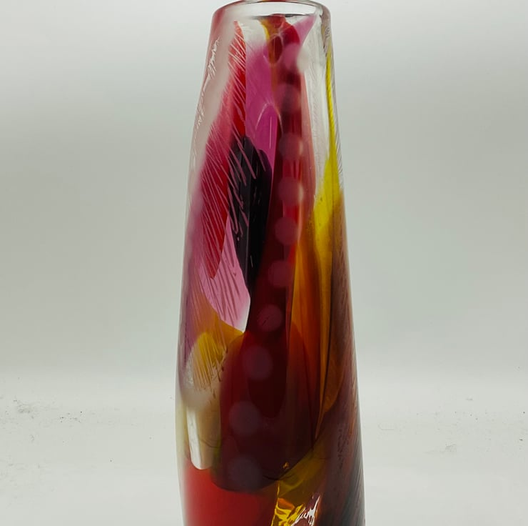 I love making these vases. I make a mosaic of the solid coloured glass pieces that I want to use cutting the pieces in different shapes. Once I heat them up in the kiln I then roll the molten clear glass across the mosaic of colour and go on to build up layers of colour and interest with glass powders and grits . Again revisiting this idea of 2 pieces in one as the sides are flattened so you have a different abstract visualisation on each side.