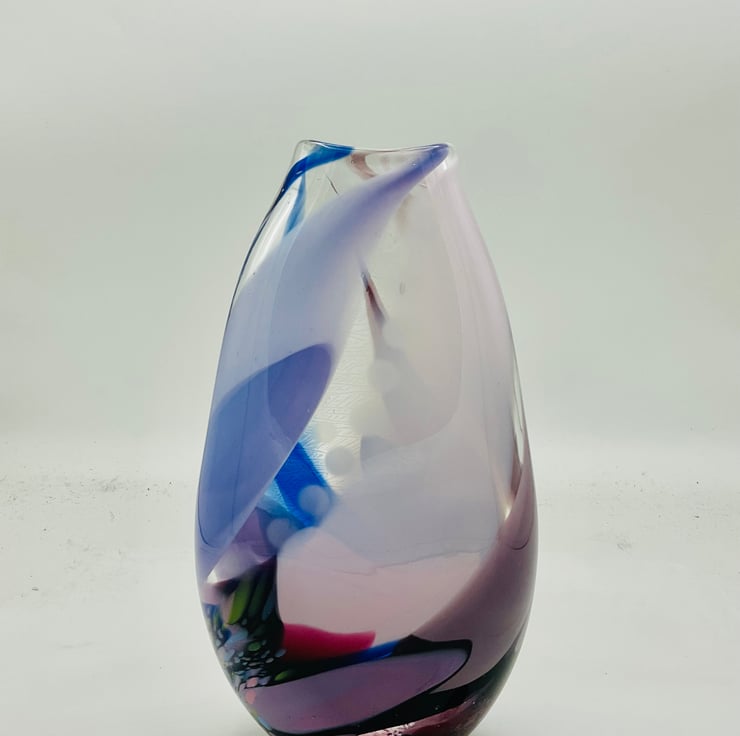 I love making these vases. I make a mosaic of the solid coloured glass pieces that I want to use cutting the pieces in different shapes. Once I heat them up in the kiln I then roll the molten clear glass across the mosaic of colour and go on to build up layers of colour and interest with glass powders and grits . Again revisiting this idea of 2 pieces in one as the sides are flattened so you have a different abstract visualisation on each side.