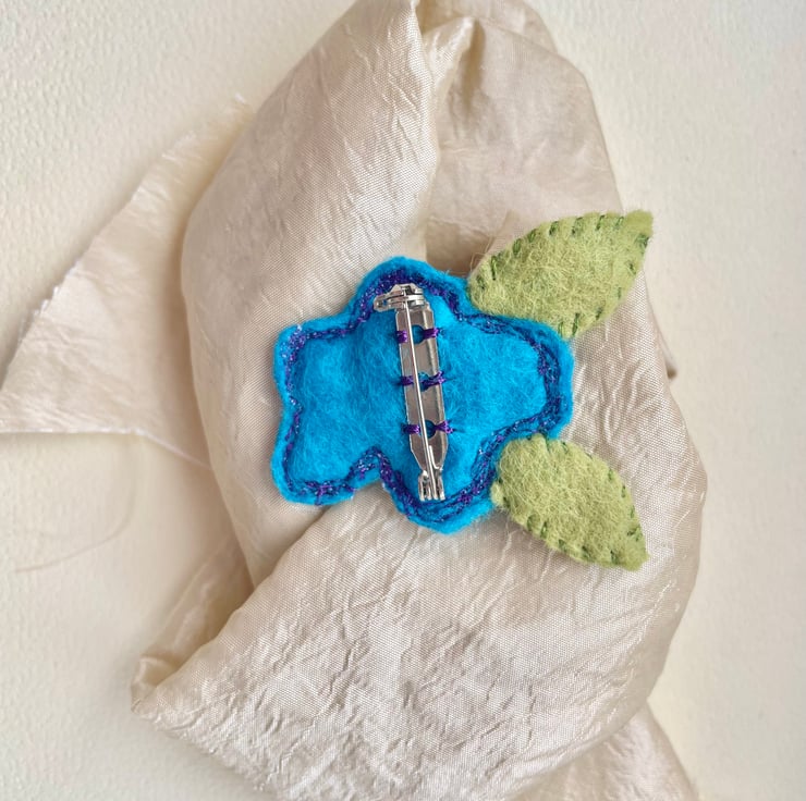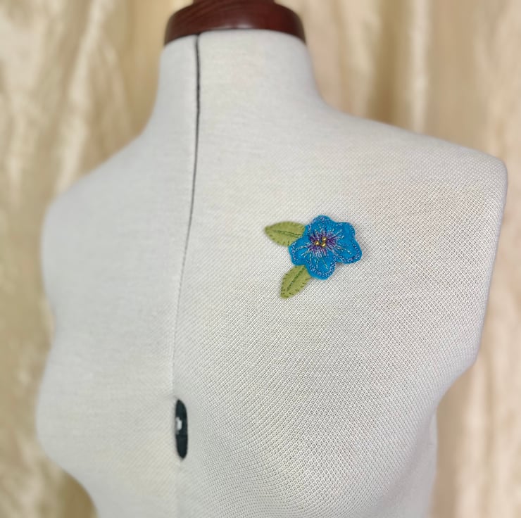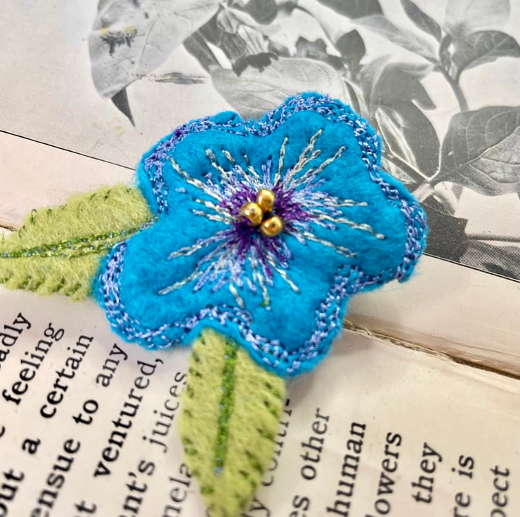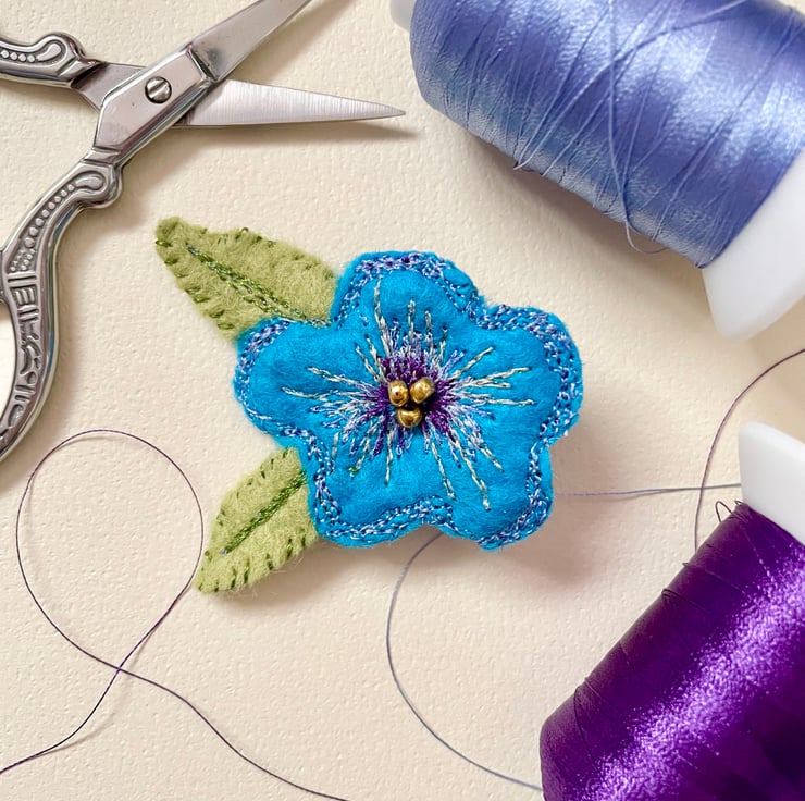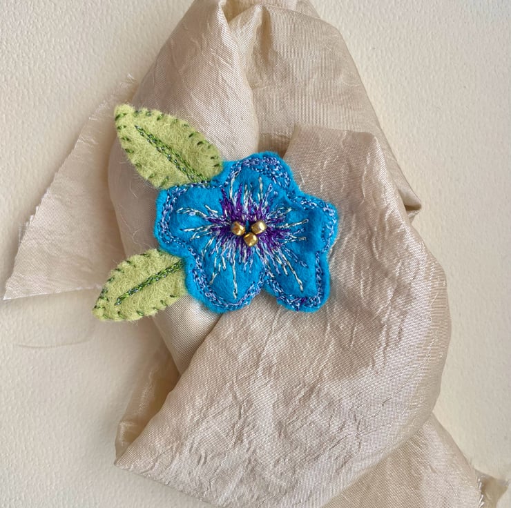 This is a bespoke hand and machine embroidered blue flax flower brooch pin. Complete with an under the leaves brooch/gift box.