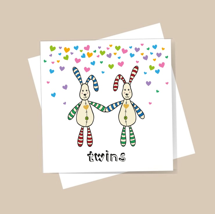 Perfect card to congratulate the birth of twins. Simple modern design with 2 gold shimmer hearts on rabbit's front.