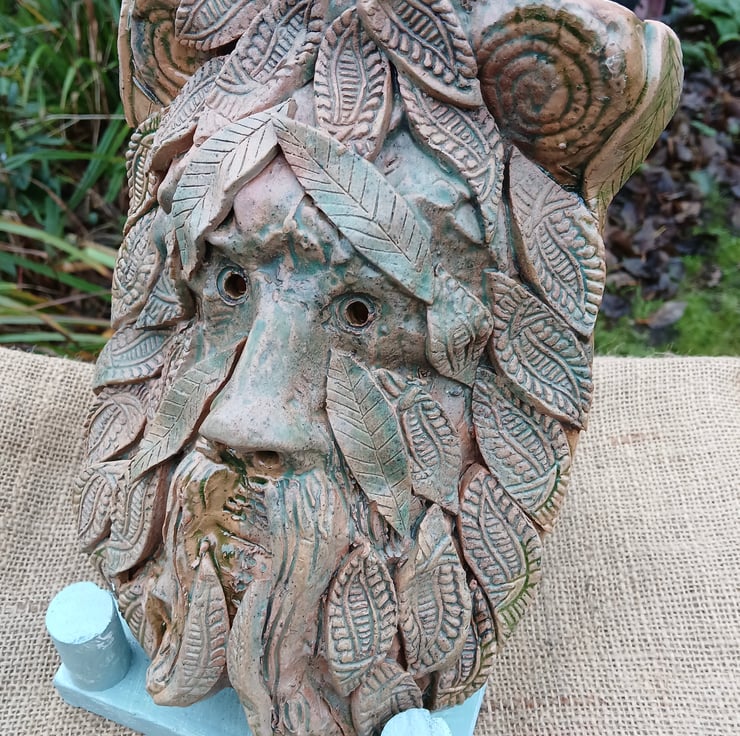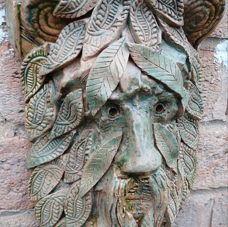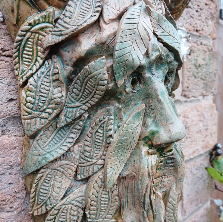 Ceramic Green Man Wall hanging with a semi matte forest green glaze.